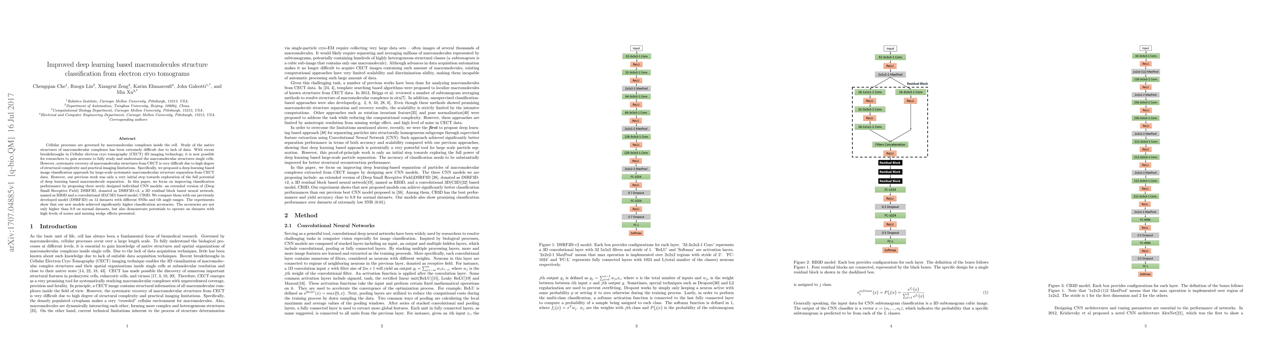 This paper proposes improved deep learning models, including DSRF3D-v2, RB3D, and CB3D, for classifying macromolecular structures from electron cryo tomography data. These models significantly outperform the previous DSRF3D model, achieving classification accuracies above 0.9 on normal datasets and demonstrating robustness on noisy and complex datasets.