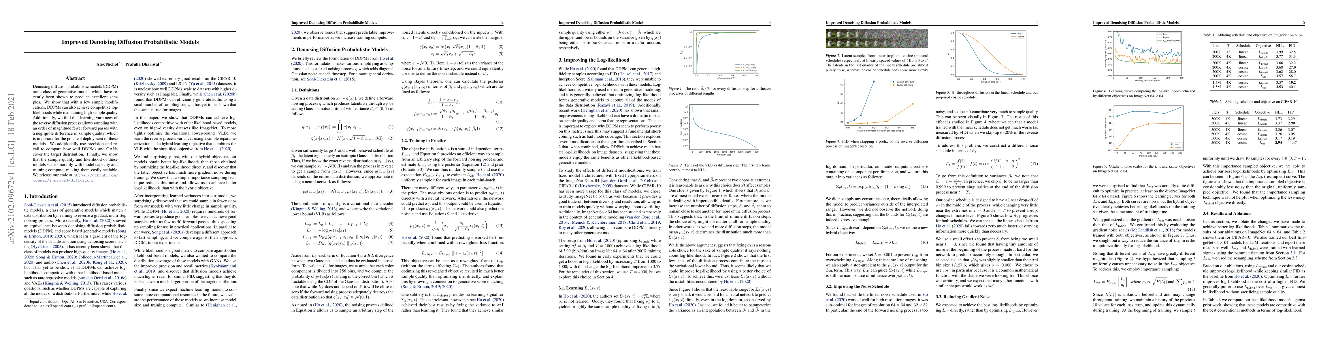 Denoising diffusion probabilistic models (DDPM) are a class of generative models which have recently been shown to produce excellent samples. We show that with a few simple modifications, DDPMs can also achieve competitive log-likelihoods while maintaining high sample quality. Additionally, we find that learning variances of the reverse diffusion process allows sampling with an order of magnitude fewer forward passes with a negligible difference in sample quality, which is important for the practical deployment of these models. We additionally use precision and recall to compare how well DDPMs and GANs cover the target distribution. Finally, we show that the sample quality and likelihood of these models scale smoothly with model capacity and training compute, making them easily scalable. We release our code at https://github.com/openai/improved-diffusion