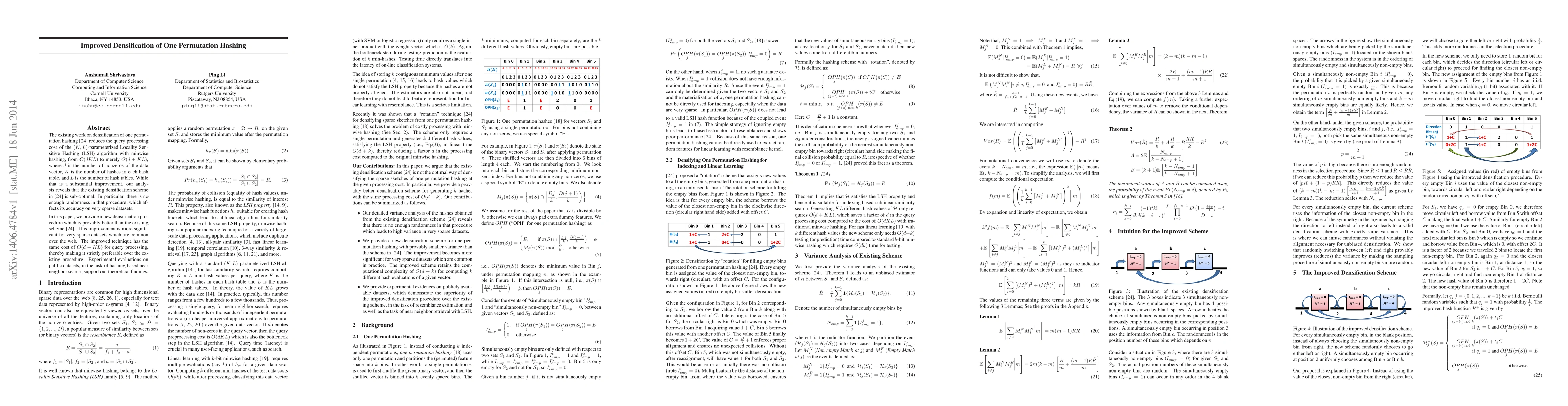 This paper proposes a new densification procedure for one permutation hashing that improves upon the existing method, particularly for very sparse datasets. The new technique maintains the same query processing cost of $O(d + KL)$ but offers better accuracy due to increased randomness, supported by experimental evaluations on public datasets.