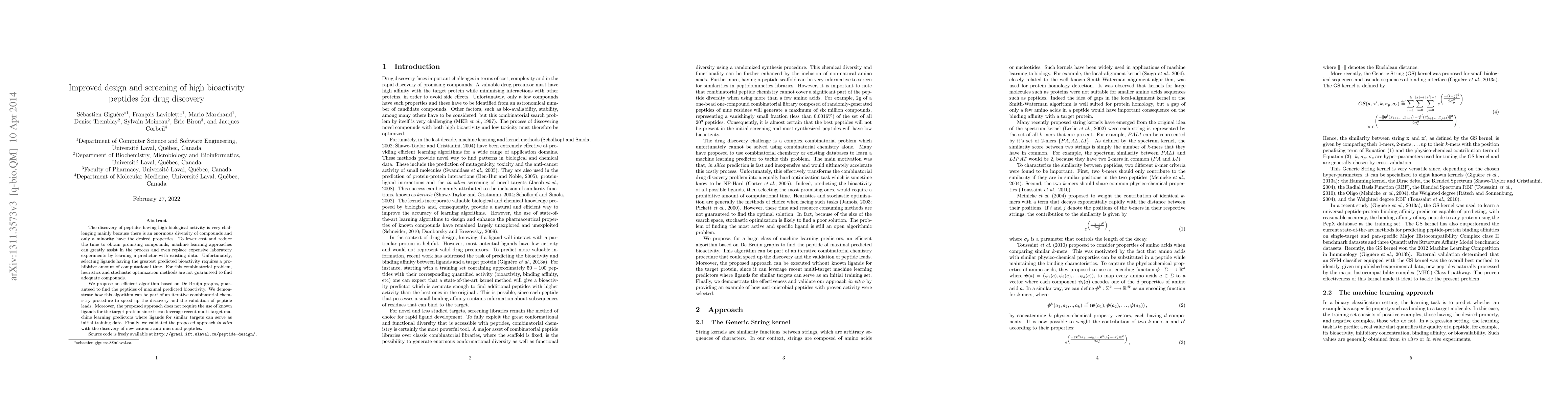 The discovery of peptides having high biological activity is very challenging mainly because there is an enormous diversity of compounds and only a minority have the desired properties. To lower cost and reduce the time to obtain promising compounds, machine learning approaches can greatly assist in the process and even replace expensive laboratory experiments by learning a predictor with existing data. Unfortunately, selecting ligands having the greatest predicted bioactivity requires a prohibitive amount of computational time. For this combinatorial problem, heuristics and stochastic optimization methods are not guaranteed to find adequate compounds. We propose an efficient algorithm based on De Bruijn graphs, guaranteed to find the peptides of maximal predicted bioactivity. We demonstrate how this algorithm can be part of an iterative combinatorial chemistry procedure to speed up the discovery and the validation of peptide leads. Moreover, the proposed approach does not require the use of known ligands for the target protein since it can leverage recent multi-target machine learning predictors where ligands for similar targets can serve as initial training data. Finally, we validated the proposed approach in vitro with the discovery of new cationic anti-microbial peptides. Source code is freely available at http://graal.ift.ulaval.ca/peptide-design/.