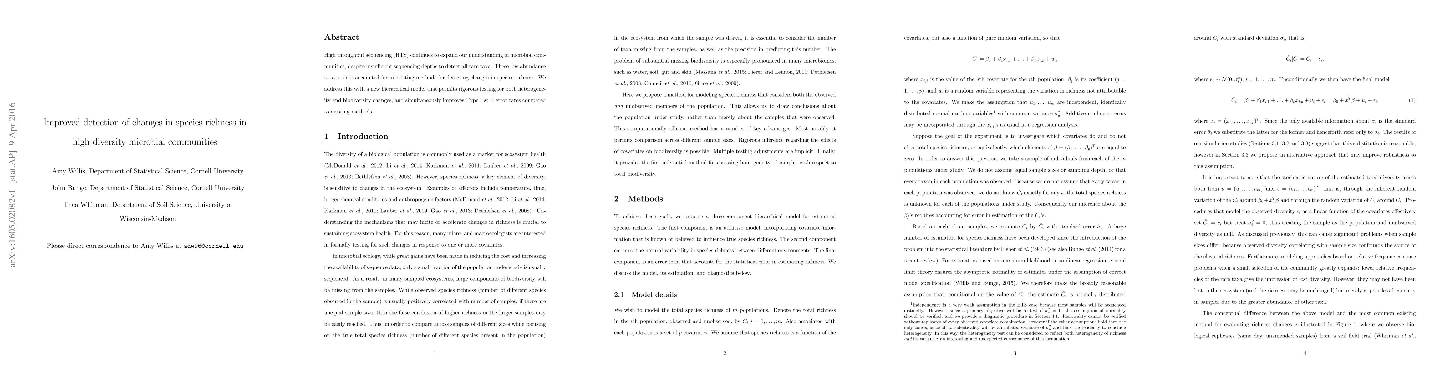 This paper introduces a novel hierarchical model to enhance the detection of changes in species richness in high-diversity microbial communities, addressing the limitations of existing methods that fail to account for rare taxa. The new model improves both Type I and II error rates in detecting biodiversity changes.