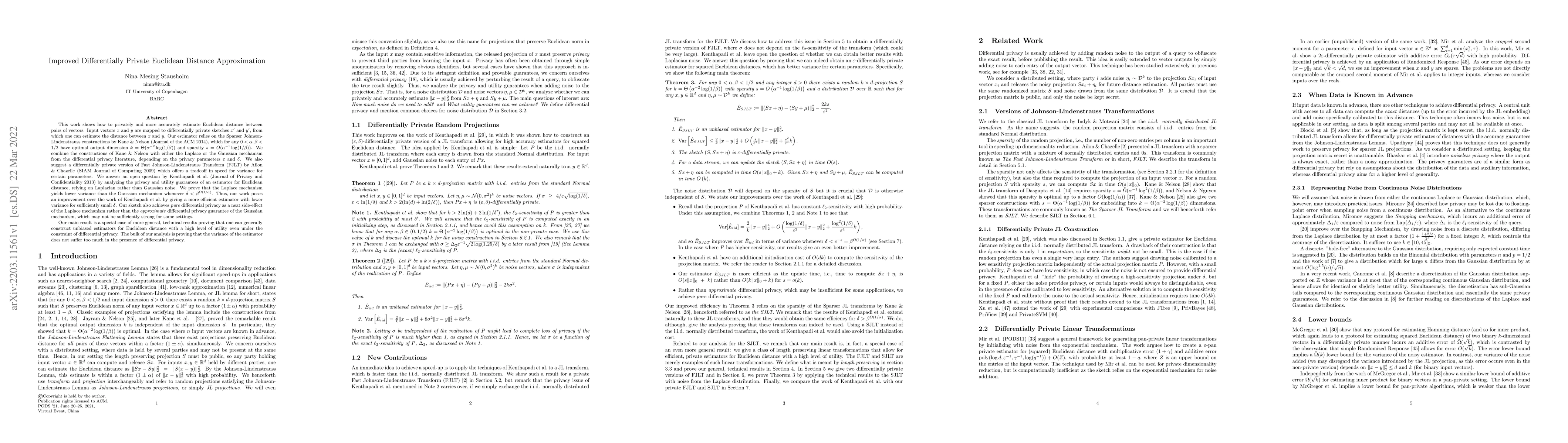 This paper improves the accuracy of estimating Euclidean distance between vectors while maintaining differential privacy, using a combination of sparse Johnson-Lindenstrauss constructions and Laplace or Gaussian mechanisms.