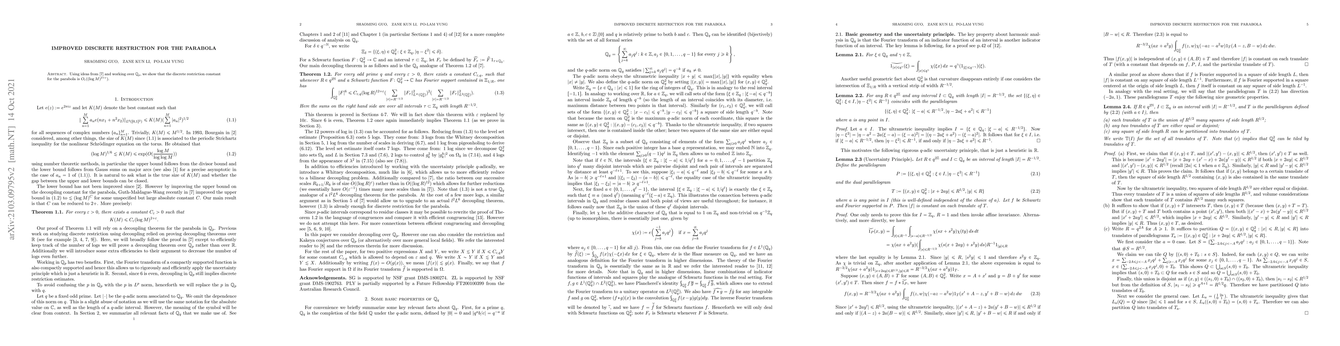 The paper employs techniques from Guth-Maldague-Wang, working over $\mathbb{Q}_p$ to improve the discrete restriction constant for the parabola.