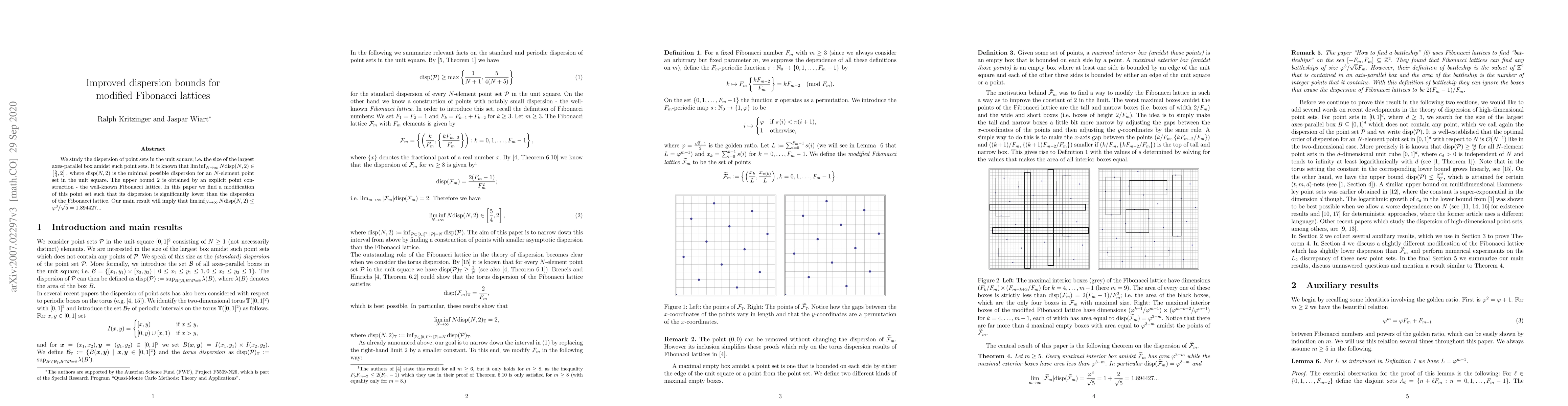 This paper investigates improved dispersion bounds for modified Fibonacci lattices in the unit square, demonstrating that a specific modification achieves a lower dispersion than the original Fibonacci lattice, thereby proving that the lower bound for $\liminf_{N\to\infty} N\mathrm{disp}(N,2)$ is $\varphi^3/\sqrt{5} \approx 1.8944$.