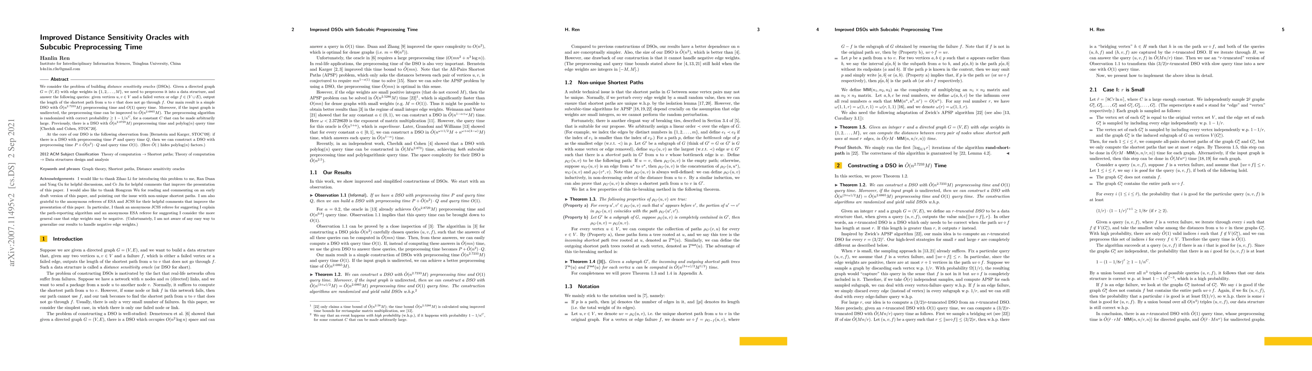 This paper presents an improved Distance Sensitivity Oracle (DSO) with subcubic preprocessing time, achieving $\tilde{O}(n^{2.7233}M)$ for directed graphs and $\tilde{O}(n^{2.6865}M)$ for undirected graphs, while maintaining $O(1)$ query time. The method builds on Bernstein and Karger's 2009 technique to enhance DSO efficiency.