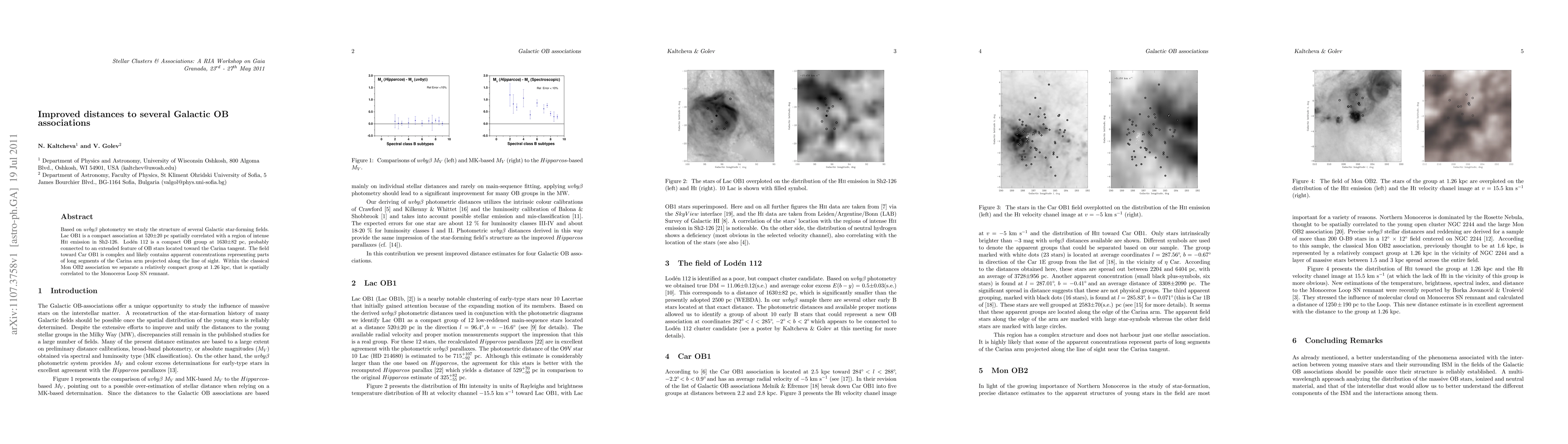 Based on uvbybeta photometry we study the structure of several Galactic star-forming fields. Lac OB1 is a compact association at 520+/-20 pc spatially correlated with a region of intense HII emission in Sh2-126. Loden 112 is a compact OB group at 1630+/-82 pc, probably connected to an extended feature of OB stars located toward the Carina tangent. The field toward Car OB1 is complex and likely contains apparent concentrations representing parts of long segments of the Carina arm projected along the line of sight. Within the classical Mon OB2 association we separate a relatively compact group at 1.26 kpc, that is spatially correlated to the Monoceros Loop SN remnant.