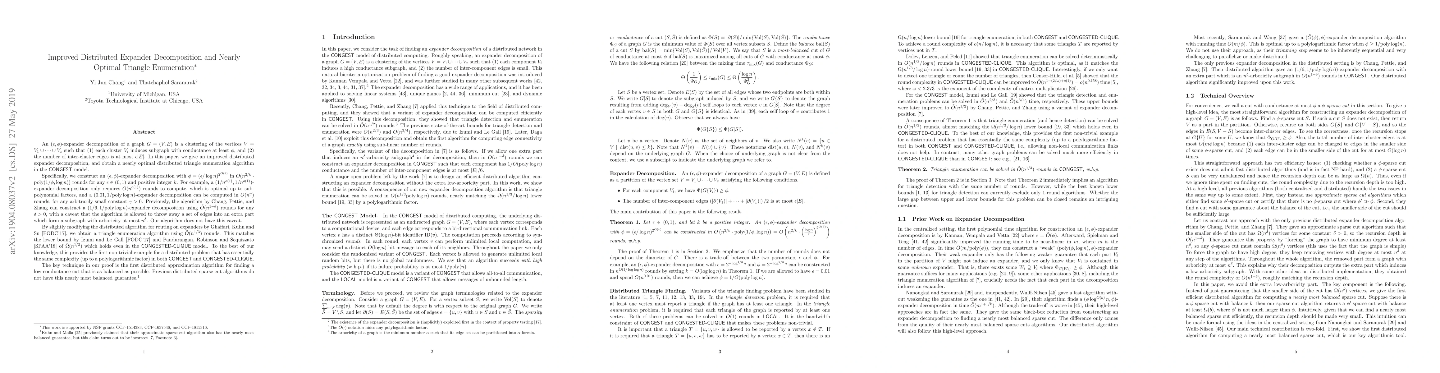 An $(\epsilon,\phi)$-expander decomposition of a graph $G=(V,E)$ is a clustering of the vertices $V=V_{1}\cup\cdots\cup V_{x}$ such that (1) each cluster $V_{i}$ induces subgraph with conductance at least $\phi$, and (2) the number of inter-cluster edges is at most $\epsilon|E|$. In this paper, we give an improved distributed expander decomposition. Specifically, we construct an $(\epsilon,\phi)$-expander decomposition with $\phi=(\epsilon/\log n)^{2^{O(k)}}$ in $O(n^{2/k}\cdot\text{poly}(1/\phi,\log n))$ rounds for any $\epsilon\in(0,1)$ and positive integer $k$. For example, a $(0.01,1/\text{poly}\log n)$-expander decomposition can be computed in $O(n^{\gamma})$ rounds, for any arbitrarily small constant $\gamma>0$. Previously, the algorithm by Chang, Pettie, and Zhang can construct a $(1/6,1/\text{poly}\log n)$-expander decomposition using $\tilde{O}(n^{1-\delta})$ rounds for any $\delta>0$, with a caveat that the algorithm is allowed to throw away a set of edges into an extra part which forms a subgraph with arboricity at most $n^{\delta}$. Our algorithm does not have this caveat. By slightly modifying the distributed algorithm for routing on expanders by Ghaffari, Kuhn and Su [PODC'17], we obtain a triangle enumeration algorithm using $\tilde{O}(n^{1/3})$ rounds. This matches the lower bound by Izumi and Le Gall [PODC'17] and Pandurangan, Robinson and Scquizzato [SPAA'18] of $\tilde{\Omega}(n^{1/3})$ which holds even in the CONGESTED CLIQUE model. This provides the first non-trivial example for a distributed problem that has essentially the same complexity (up to a polylogarithmic factor) in both CONGEST and CONGESTED CLIQUE. The key technique in our proof is the first distributed approximation algorithm for finding a low conductance cut that is as balanced as possible. Previous distributed sparse cut algorithms do not have this nearly most balanced guarantee.