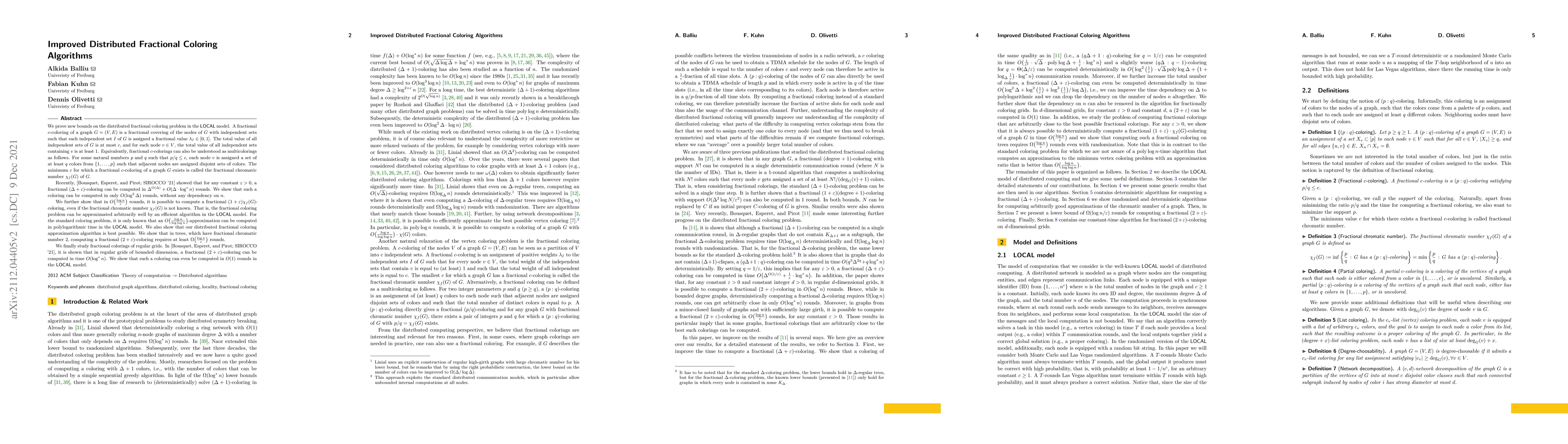 This paper presents improved distributed algorithms for fractional coloring in the LOCAL model, achieving fractional $(\Delta+\epsilon)$-coloring in $O(\log^2 \Delta)$ rounds and a fractional $(1+\epsilon)\chi_f(G)$-coloring in $O(\frac{\log n}{\epsilon})$ rounds, without prior knowledge of $\chi_f(G)$. It also demonstrates that computing a fractional $(2+\epsilon)$-coloring in trees requires $\Omega(\frac{\log n}{\epsilon})$ rounds and shows that fractional colorings of regular grids can be achieved in constant rounds.
