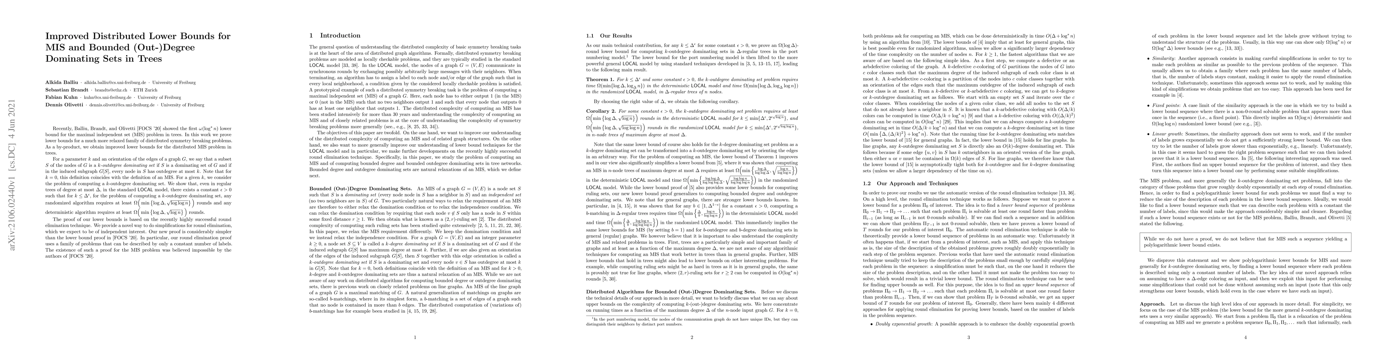 This paper establishes improved distributed lower bounds for computing maximal independent sets (MIS) and k-outdegree dominating sets in trees, showing that randomized algorithms need at least Ω(logΔ or √loglogn) rounds, and deterministic algorithms require Ω(logΔ or √logn) rounds, using a simplified round elimination technique.
