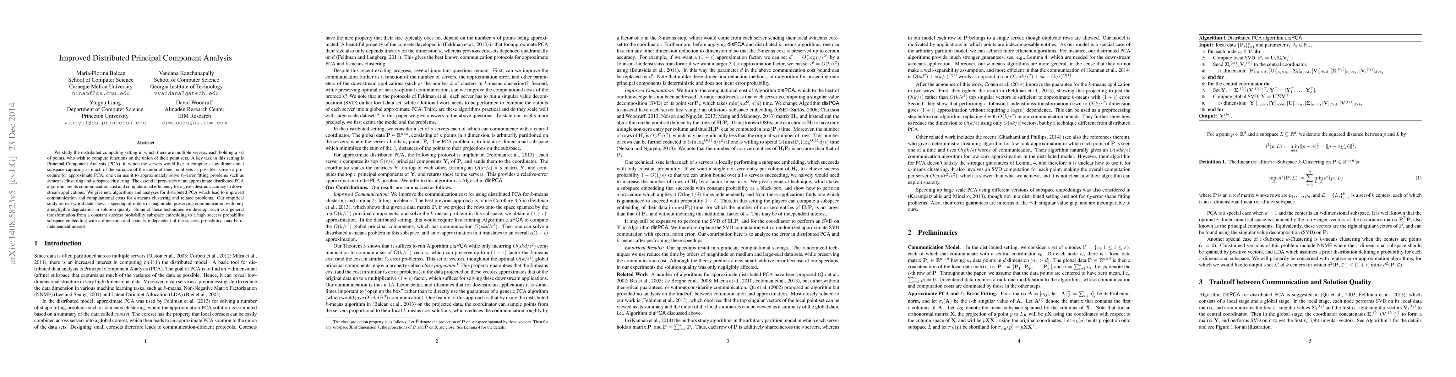 This paper presents improved algorithms for distributed Principal Component Analysis (PCA) that significantly reduce communication and computational costs while maintaining solution quality for downstream tasks like $k$-means clustering. The proposed methods achieve substantial speedups in real-world data applications, demonstrating techniques that may be useful beyond PCA.