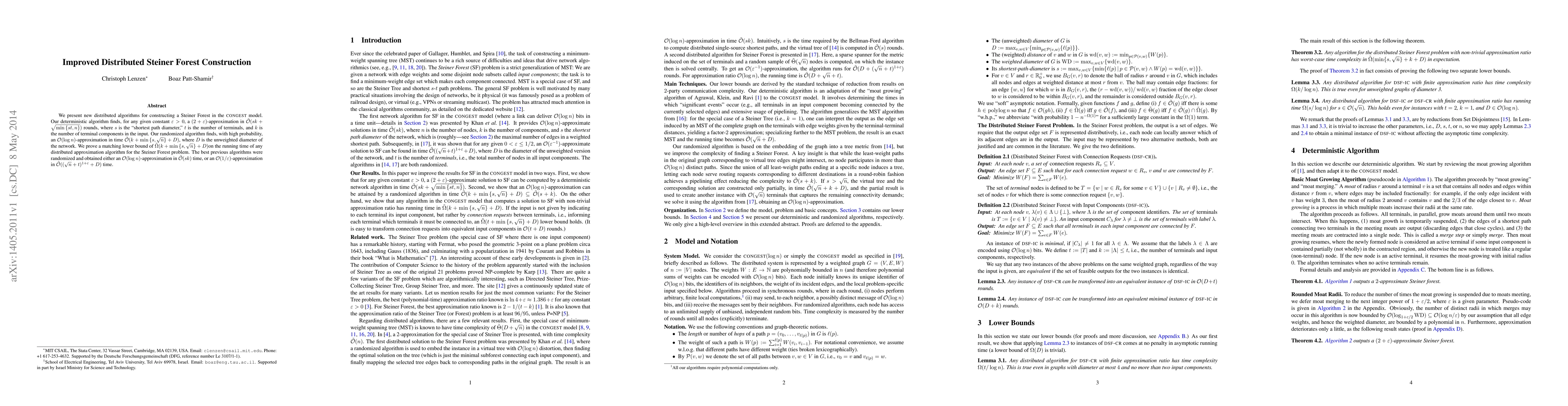We present new distributed algorithms for constructing a Steiner Forest in the CONGEST model. Our deterministic algorithm finds, for any given constant $\epsilon>0$, a $(2+\epsilon)$-approximation in $\tilde{O}(sk+\sqrt{\min(st,n)})$ rounds, where $s$ is the shortest path diameter, $t$ is the number of terminals, $k$ is the number of terminal components in the input, and $n$ is the number of nodes. Our randomized algorithm finds, with high probability, an $O(\log n)$- approximation in time $\tilde{O}(k+\min(s,\sqrt n)+D)$, where $D$ is the unweighted diameter of the network. We also prove a matching lower bound of $\tilde{\Omega}(k+\min(s,\sqrt{n})+D)$ on the running time of any distributed approximation algorithm for the Steiner Forest problem. Previous algorithms were randomized, and obtained either an $O(\log n)$-approximation in $\tilde{O}(sk)$ time, or an $O(1/\epsilon)$-approximation in $\tilde{O}((\sqrt{n}+t)^{1+\epsilon}+D)$ time.