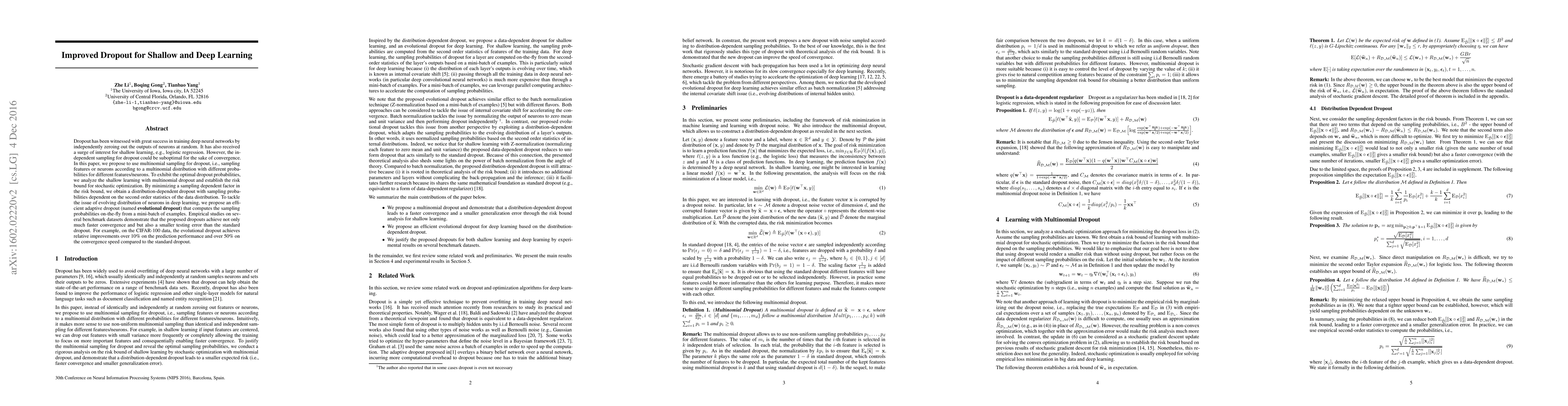 Dropout has been witnessed with great success in training deep neural networks by independently zeroing out the outputs of neurons at random. It has also received a surge of interest for shallow learning, e.g., logistic regression. However, the independent sampling for dropout could be suboptimal for the sake of convergence. In this paper, we propose to use multinomial sampling for dropout, i.e., sampling features or neurons according to a multinomial distribution with different probabilities for different features/neurons. To exhibit the optimal dropout probabilities, we analyze the shallow learning with multinomial dropout and establish the risk bound for stochastic optimization. By minimizing a sampling dependent factor in the risk bound, we obtain a distribution-dependent dropout with sampling probabilities dependent on the second order statistics of the data distribution. To tackle the issue of evolving distribution of neurons in deep learning, we propose an efficient adaptive dropout (named \textbf{evolutional dropout}) that computes the sampling probabilities on-the-fly from a mini-batch of examples. Empirical studies on several benchmark datasets demonstrate that the proposed dropouts achieve not only much faster convergence and but also a smaller testing error than the standard dropout. For example, on the CIFAR-100 data, the evolutional dropout achieves relative improvements over 10\% on the prediction performance and over 50\% on the convergence speed compared to the standard dropout.