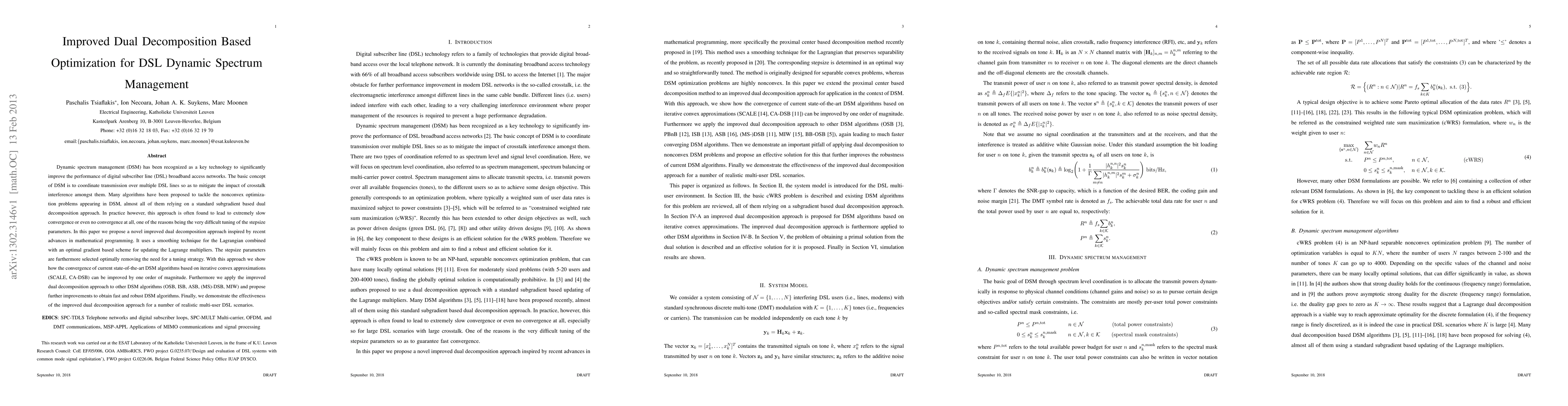 Dynamic spectrum management (DSM) has been recognized as a key technology to significantly improve the performance of digital subscriber line (DSL) broadband access networks. The basic concept of DSM is to coordinate transmission over multiple DSL lines so as to mitigate the impact of crosstalk interference amongst them. Many algorithms have been proposed to tackle the nonconvex optimization problems appearing in DSM, almost all of them relying on a standard subgradient based dual decomposition approach. In practice however, this approach is often found to lead to extremely slow convergence or even no convergence at all, one of the reasons being the very difficult tuning of the stepsize parameters. In this paper we propose a novel improved dual decomposition approach inspired by recent advances in mathematical programming. It uses a smoothing technique for the Lagrangian combined with an optimal gradient based scheme for updating the Lagrange multipliers. The stepsize parameters are furthermore selected optimally removing the need for a tuning strategy. With this approach we show how the convergence of current state-of-the-art DSM algorithms based on iterative convex approximations (SCALE, CA-DSB) can be improved by one order of magnitude. Furthermore we apply the improved dual decomposition approach to other DSM algorithms (OSB, ISB, ASB, (MS)-DSB, MIW) and propose further improvements to obtain fast and robust DSM algorithms. Finally, we demonstrate the effectiveness of the improved dual decomposition approach for a number of realistic multi-user DSL scenarios.