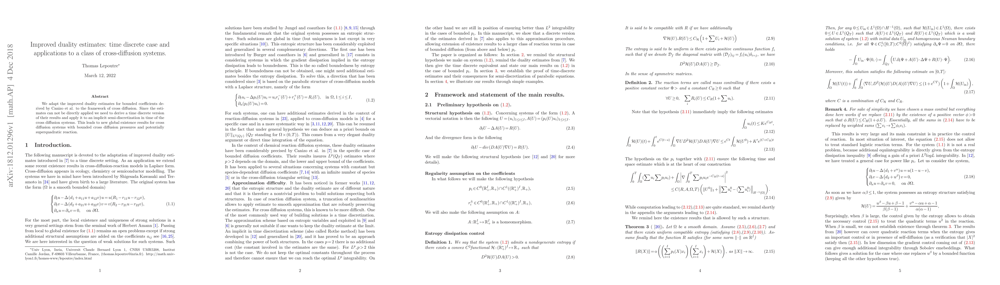 Summary: This paper adapts improved duality estimates for bounded coefficients to cross-diffusion systems by developing a time discrete version, leading to new global existence results for these systems with bounded cross diffusion pressures and potentially superquadratic reaction.