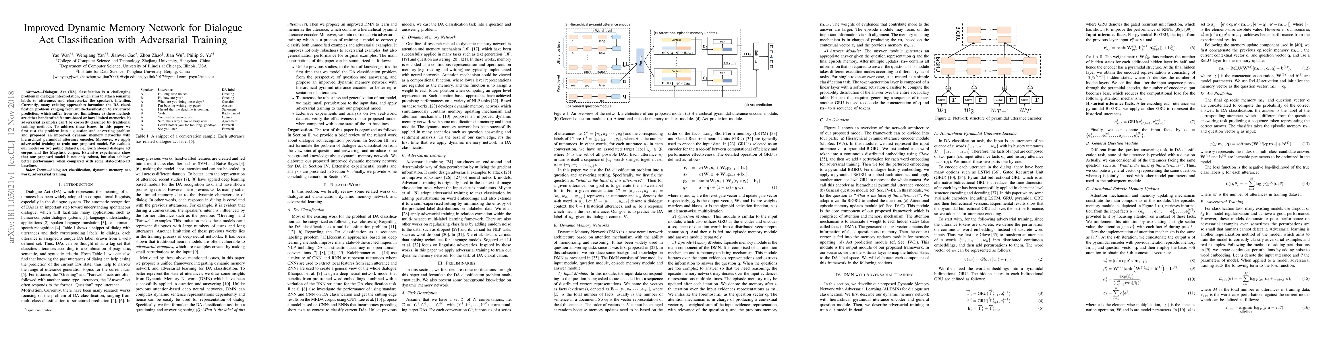 This paper proposes an improved dynamic memory network with adversarial training for Dialogue Act classification, addressing limitations of existing methods by incorporating a hierarchical pyramidal encoder and demonstrating superior performance and robustness on two public datasets.