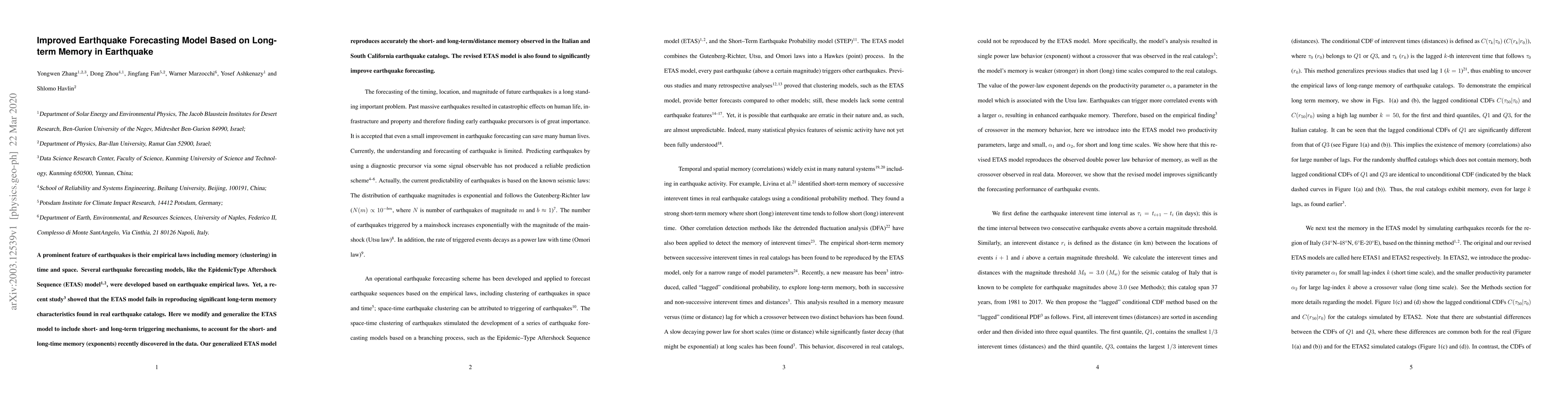 This paper modifies the ETAS earthquake forecasting model to incorporate both short- and long-term memory mechanisms, improving its accuracy in predicting earthquakes by accurately reproducing the observed memory patterns in Italian and Southern California earthquake catalogs. The enhanced model significantly improves earthquake forecasting capabilities.
