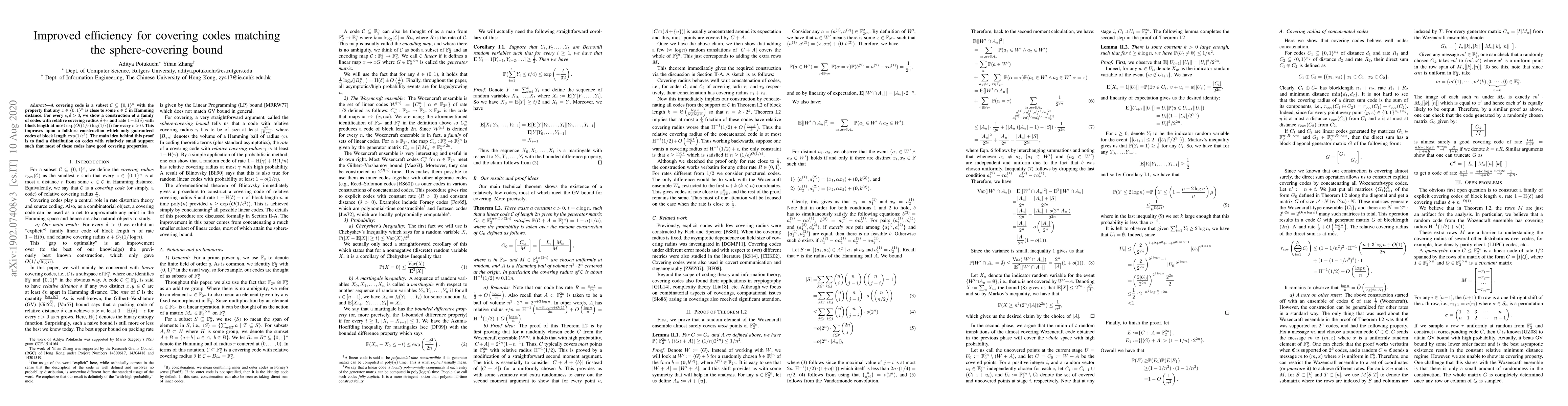 A covering code is a subset $\mathcal{C} \subseteq \{0,1\}^n$ with the property that any $z \in \{0,1\}^n$ is close to some $c \in \mathcal{C}$ in Hamming distance. For every $\epsilon,\delta>0$, we show a construction of a family of codes with relative covering radius $\delta + \epsilon$ and rate $1 - \mathrm{H}(\delta) $ with block length at most $\exp(O((1/\epsilon) \log (1/\epsilon)))$ for every $\epsilon > 0$. This improves upon a folklore construction which only guaranteed codes of block length $\exp(1/\epsilon^2)$. The main idea behind this proof is to find a distribution on codes with relatively small support such that most of these codes have good covering properties.