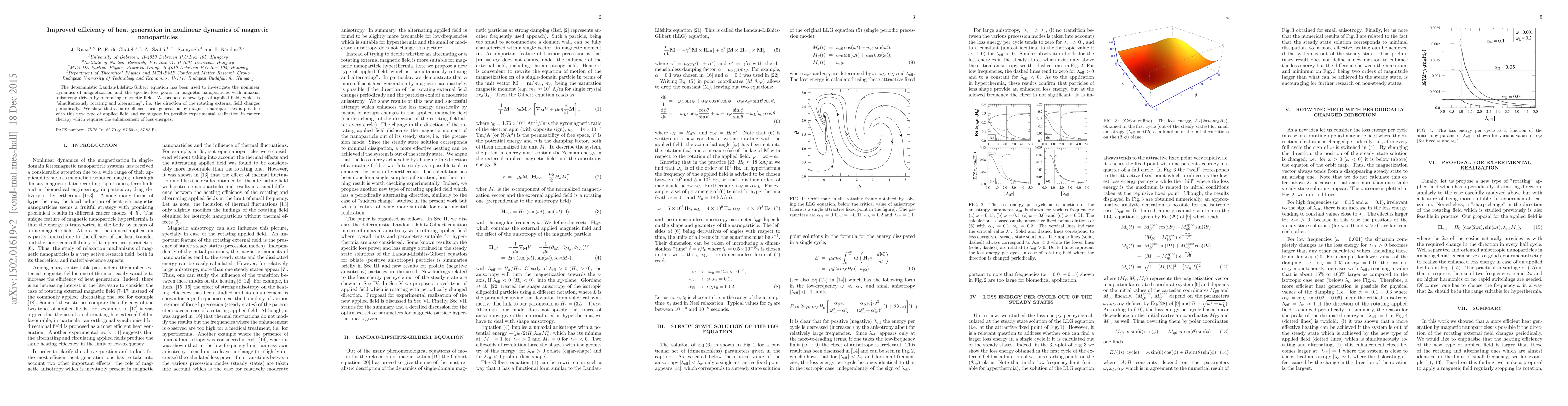 This paper investigates the nonlinear dynamics of magnetization in magnetic nanoparticles using the Landau-Lifshitz-Gilbert equation, proposing a "simultaneously rotating and alternating" magnetic field to enhance heat generation efficiency. The study suggests this method could improve loss energies for potential applications in cancer therapy.