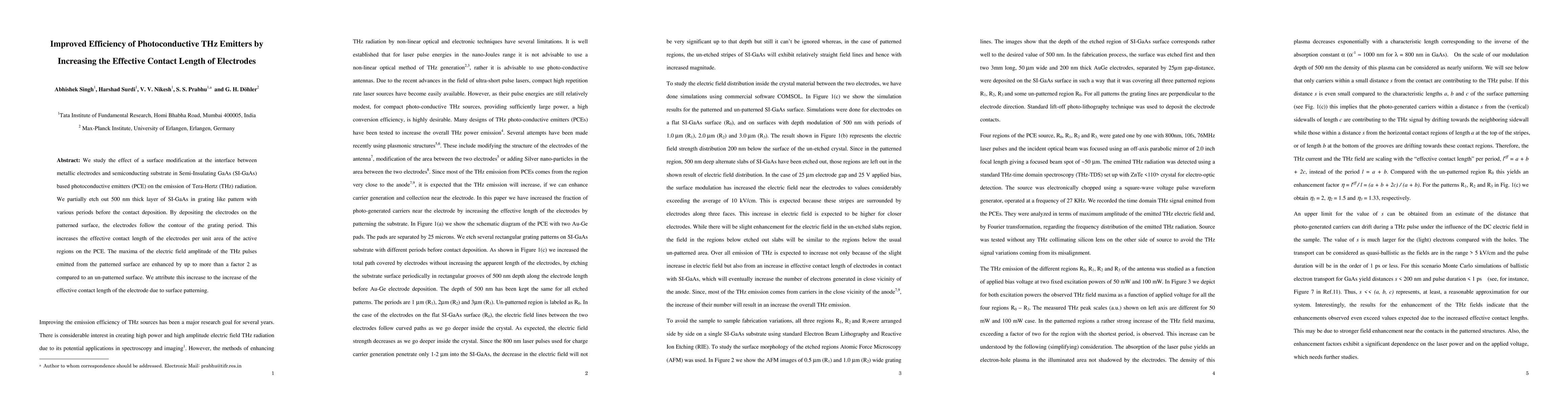 We study the effect of a surface modification at the interface between metallic electrodes and semiconducting substrate in Semi-Insulating GaAs (SI-GaAs) based photoconductive emitters (PCE) on the emission of Tera-Hertz (THz) radiation. We partially etch out 500 nm thick layer of SI-GaAs in grating like pattern with various periods before the contact deposition. By depositing the electrodes on the patterned surface, the electrodes follow the contour of the grating period. This increases the effective contact length of the electrodes per unit area of the active regions on the PCE. The maxima of the electric field amplitude of the THz pulses emitted from the patterned surface are enhanced by up to more than a factor 2 as compared to an un-patterned surface. We attribute this increase to the increase of the effective contact length of the electrode due to surface patterning.