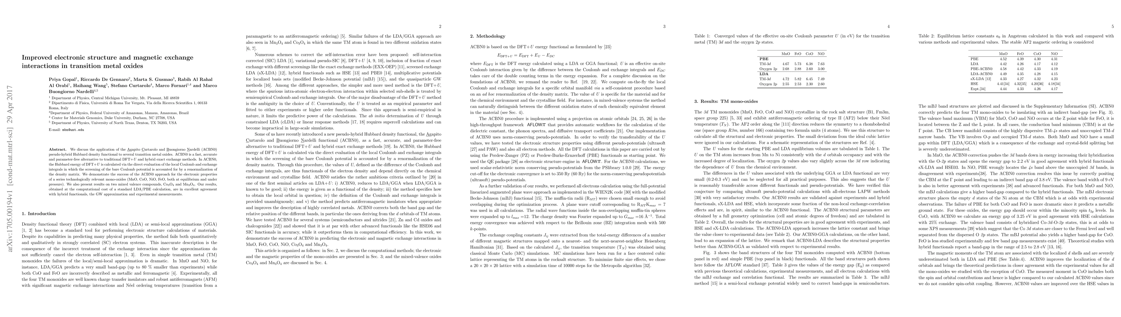 This paper applies the ACBN0 pseudo-hybrid Hubbard density functional to transition metal oxides, demonstrating its accuracy and efficiency. The method provides precise electronic structure and magnetic exchange interactions, comparable to hybrid functionals and experiments, at a lower computational cost.