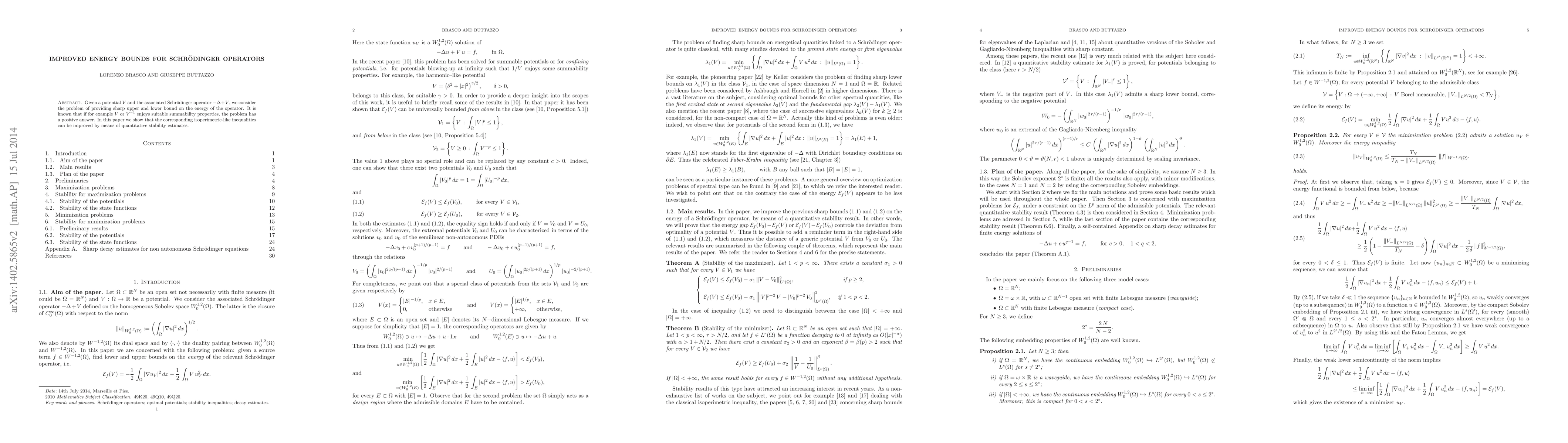 Given a potential $V$ and the associated Schr\"odinger operator $-\Delta+V$, we consider the problem of providing sharp upper and lower bound on the energy of the operator. It is known that if for example $V$ or $V^{-1}$ enjoys suitable summability properties, the problem has a positive answer. In this paper we show that the corresponding isoperimetric-like inequalities can be improved by means of quantitative stability estimates.