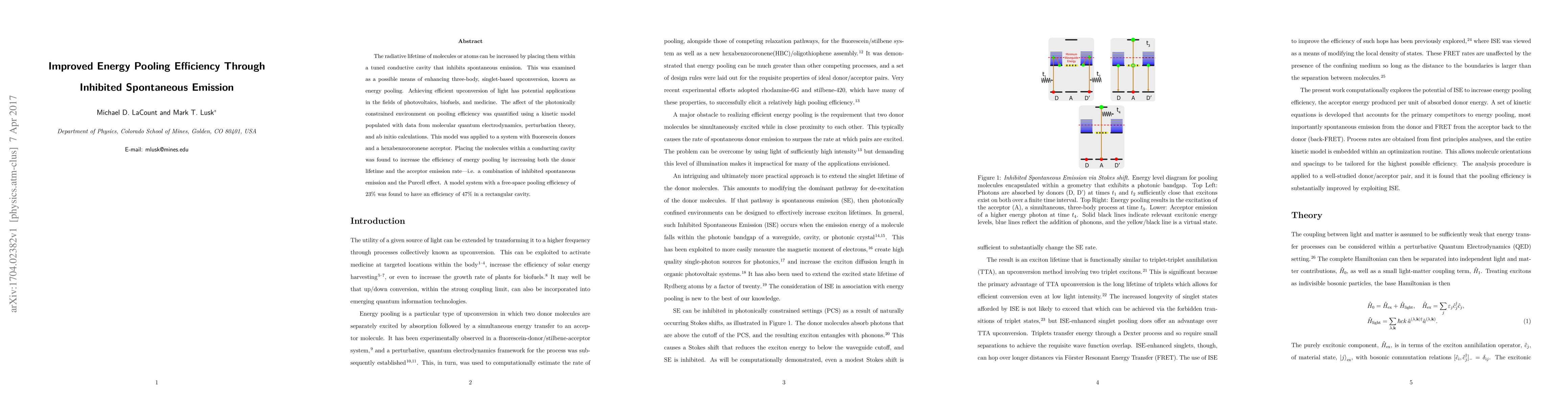 The radiative lifetime of molecules or atoms can be increased by placing them within a tuned conductive cavity that inhibits spontaneous emission. This was examined as a possible means of enhancing three-body, singlet-based upconversion, known as energy pooling. Achieving efficient upconversion of light has potential applications in the fields of photovoltaics, biofuels, and medicine. The affect of the photonically constrained environment on pooling efficiency was quantified using a kinetic model populated with data from molecular quantum electrodynamics, perturbation theory, and ab initio calculations. This model was applied to a system with fluorescein donors and a hexabenzocoronene acceptor. Placing the molecules within a conducting cavity was found to increase the efficiency of energy pooling by increasing both the donor lifetime and the acceptor emission rate--i.e. a combination of inhibited spontaneous emission and the Purcell effect. A model system with a free-space pooling efficiency of 23% was found to have an efficiency of 47% in a rectangular cavity.
