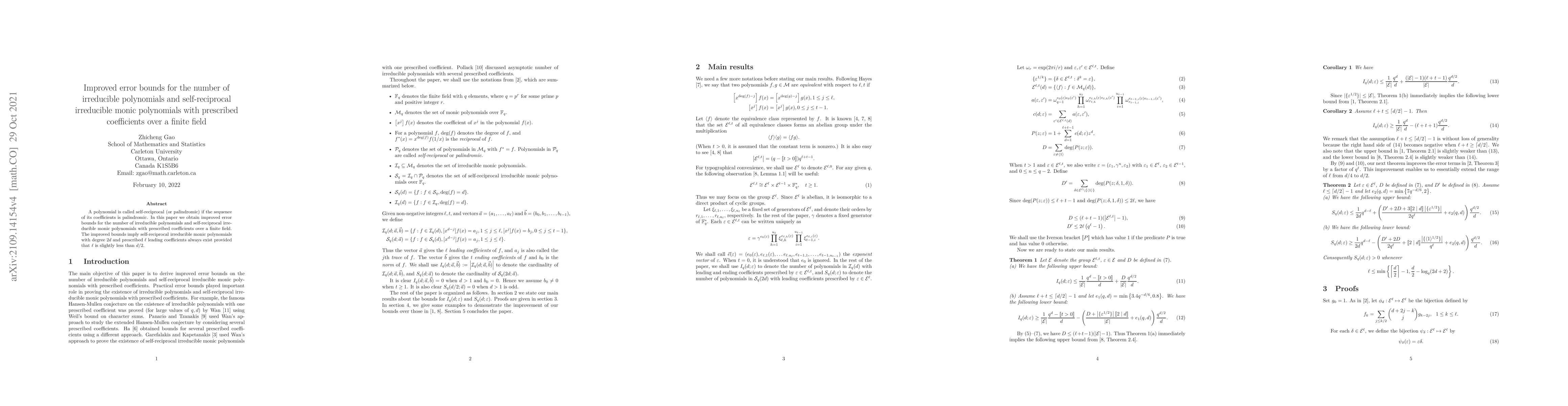 A polynomial is called self-reciprocal (or palindromic) if the sequence of its coefficients is palindromic. In this paper we obtain improved error bounds for the number of irreducible polynomials and self-reciprocal irreducible monic polynomials with prescribed coefficients over a finite field. The improved bounds imply that self-reciprocal irreducible monic polynomials with degree $2d$ always exist provided that the number of prescribed leading coefficients is slightly less than $ d/2$.