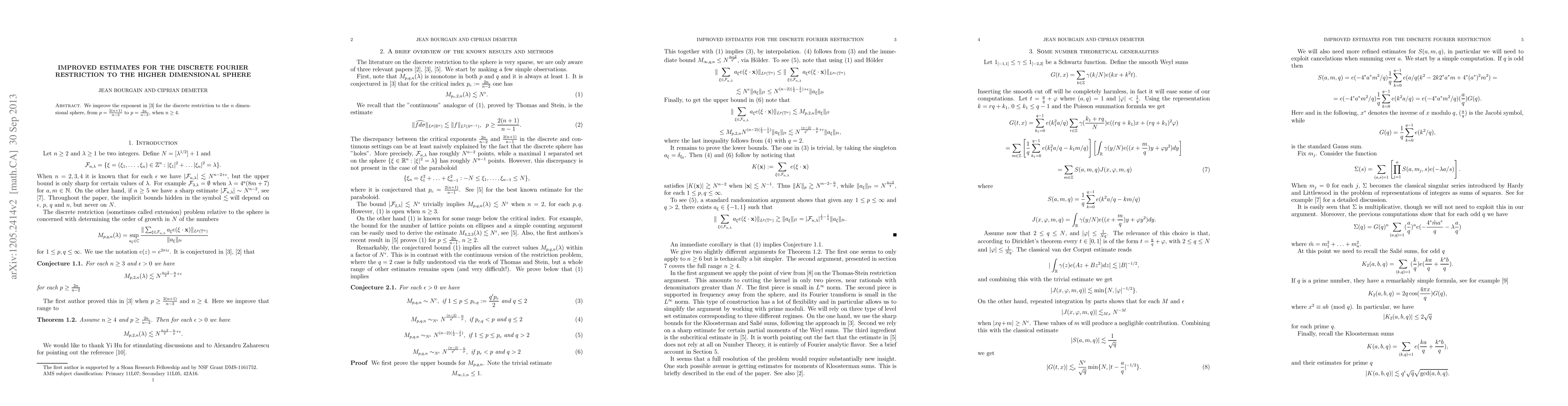 We improve the exponent for the discrete Fourier restriction to the $n$ dimensional sphere, from $p=\frac{2(n+1)}{n-3}$ to $p=\frac{2n}{n-3}$, when $n\ge 4$.