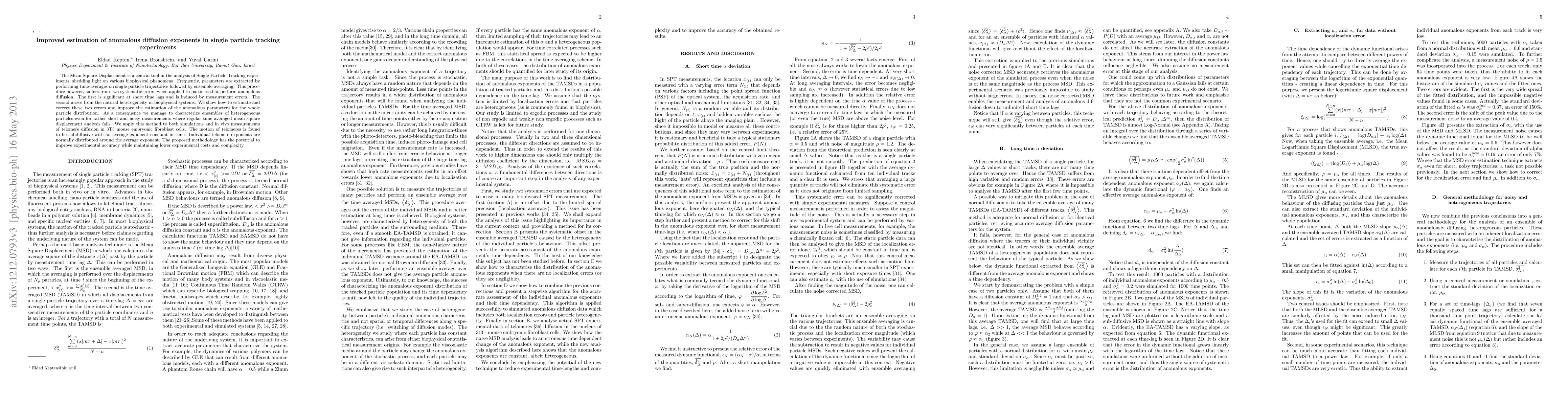 This paper presents an improved method for estimating anomalous diffusion exponents in single particle tracking experiments, correcting systematic errors from measurement noise and system heterogeneity. The new approach enhances the characterization of heterogeneous particle ensembles, demonstrated through simulations and in vivo telomere diffusion studies in cells.