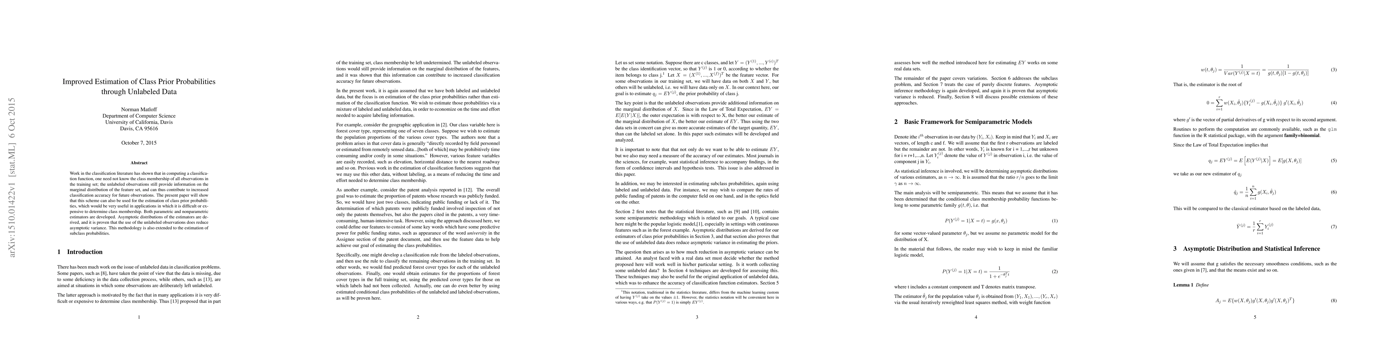Work in the classification literature has shown that in computing a classification function, one need not know the class membership of all observations in the training set; the unlabeled observations still provide information on the marginal distribution of the feature set, and can thus contribute to increased classification accuracy for future observations. The present paper will show that this scheme can also be used for the estimation of class prior probabilities, which would be very useful in applications in which it is difficult or expensive to determine class membership. Both parametric and nonparametric estimators are developed. Asymptotic distributions of the estimators are derived, and it is proven that the use of the unlabeled observations does reduce asymptotic variance. This methodology is also extended to the estimation of subclass probabilities.