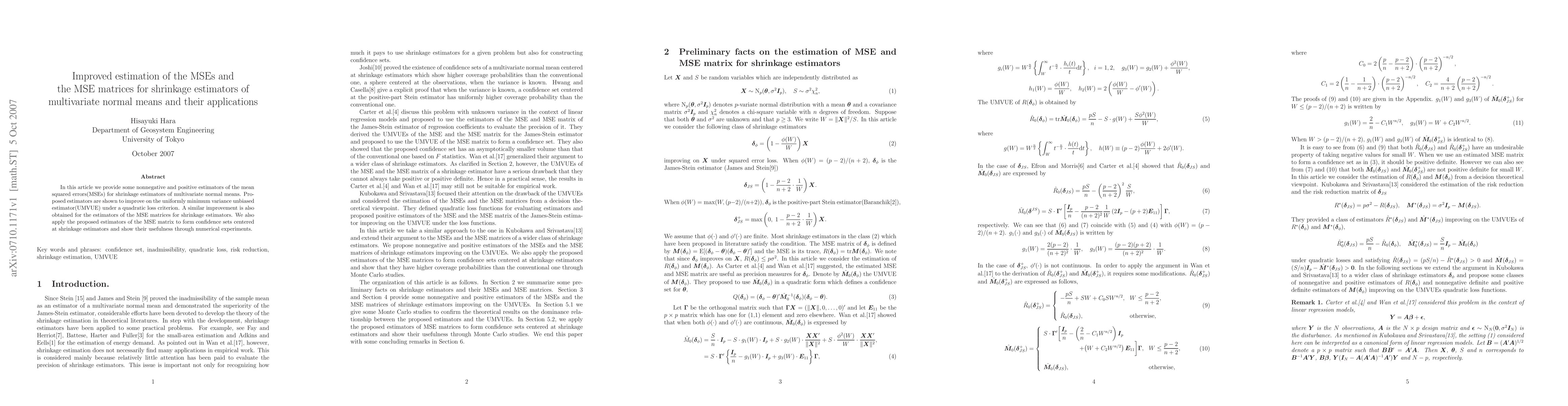 In this article we provide some nonnegative and positive estimators of the mean squared errors(MSEs) for shrinkage estimators of multivariate normal means. Proposed estimators are shown to improve on the uniformly minimum variance unbiased estimator(UMVUE) under a quadratic loss criterion. A similar improvement is also obtained for the estimators of the MSE matrices for shrinkage estimators. We also apply the proposed estimators of the MSE matrix to form confidence sets centered at shrinkage estimators and show their usefulness through numerical experiments.