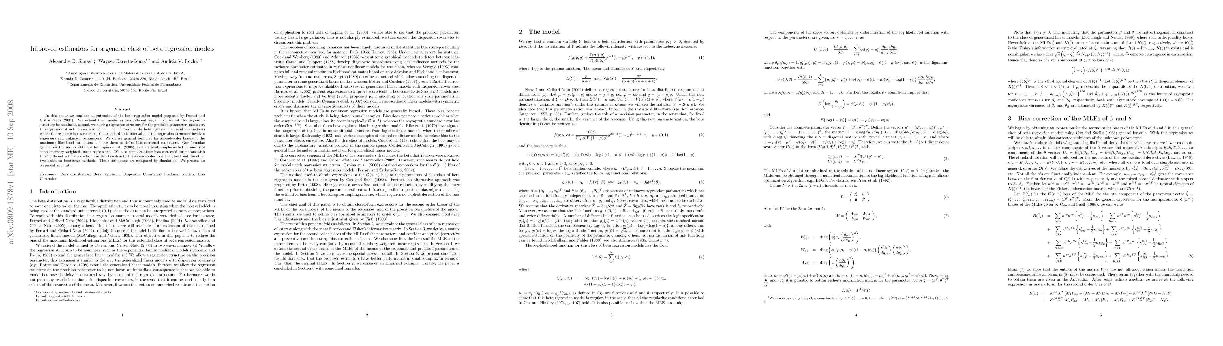 In this paper we consider an extension of the beta regression model proposed by Ferrari and Cribari-Neto (2004). We extend their model in two different ways, first, we let the regression structure be nonlinear, second, we allow a regression structure for the precision parameter, moreover, this regression structure may also be nonlinear. Generally, the beta regression is useful to situations where the response is restricted to the standard unit interval and the regression structure involves regressors and unknown parameters. We derive general formulae for second-order biases of the maximum likelihood estimators and use them to define bias-corrected estimators. Our formulae generalizes the results obtained by Ospina et al. (2006), and are easily implemented by means of supplementary weighted linear regressions. We also compare these bias-corrected estimators with three different estimators which are also bias-free to the second-order, one analytical and the other two based on bootstrap methods. These estimators are compared by simulation. We present an empirical application.