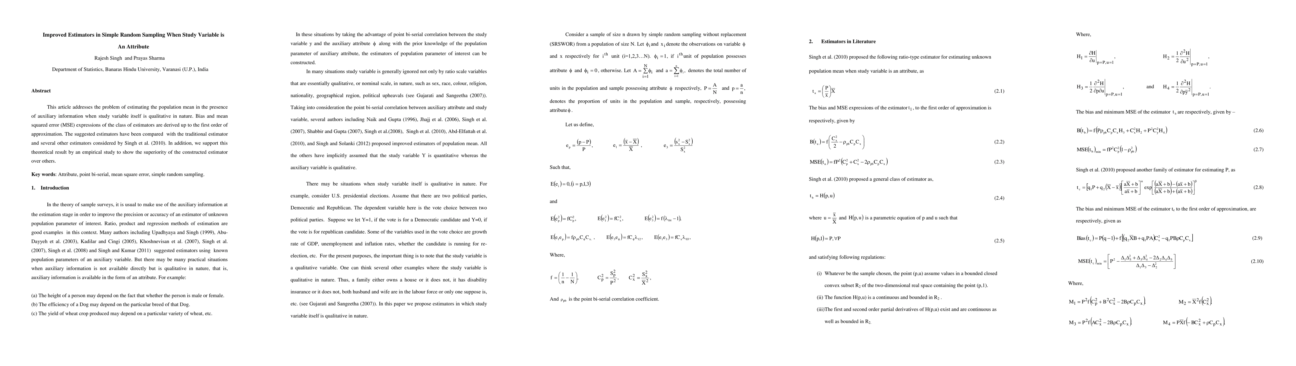 This paper improves estimators for estimating a population mean when the study variable is qualitative, reducing bias and error. An empirical study supports the superiority of the new estimator over traditional methods.