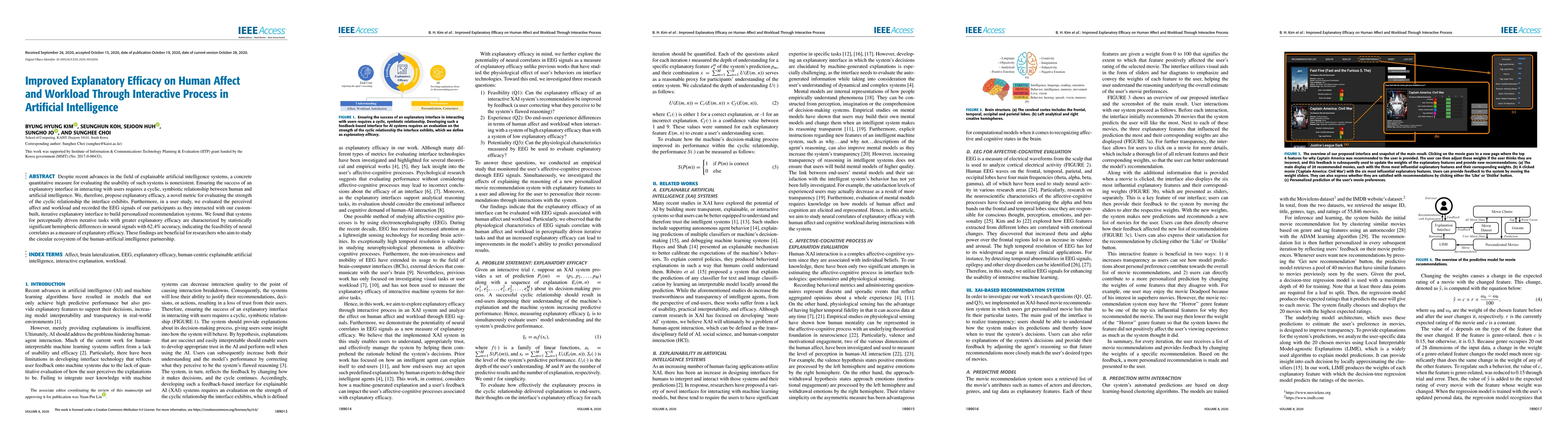 Despite recent advances in the field of explainable artificial intelligence systems, a concrete quantitative measure for evaluating the usability of such systems is nonexistent. Ensuring the success of an explanatory interface in interacting with users requires a cyclic, symbiotic relationship between human and artificial intelligence. We, therefore, propose explanatory efficacy, a novel metric for evaluating the strength of the cyclic relationship the interface exhibits. Furthermore, in a user study, we evaluated the perceived affect and workload and recorded the EEG signals of our participants as they interacted with our custom-built, iterative explanatory interface to build personalized recommendation systems. We found that systems for perceptually driven iterative tasks with greater explanatory efficacy are characterized by statistically significant hemispheric differences in neural signals with 62.4% accuracy, indicating the feasibility of neural correlates as a measure of explanatory efficacy. These findings are beneficial for researchers who aim to study the circular ecosystem of the human-artificial intelligence partnership.