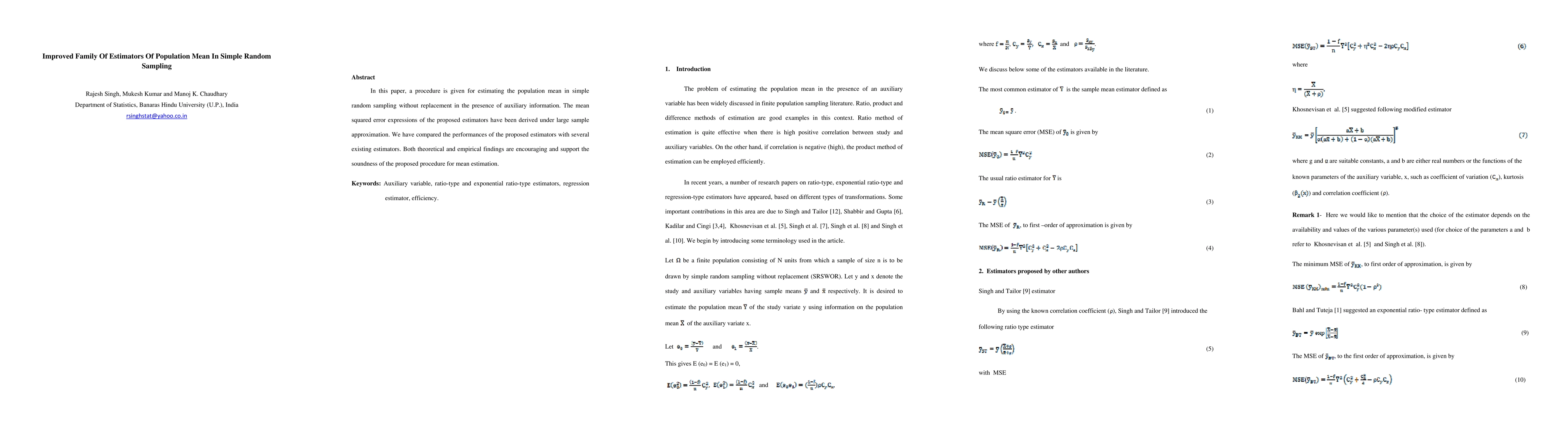 This paper introduces new estimators for the population mean in simple random sampling, leveraging auxiliary information to improve accuracy. Theoretical and empirical comparisons show that the proposed estimators outperform existing methods, supporting their effectiveness.