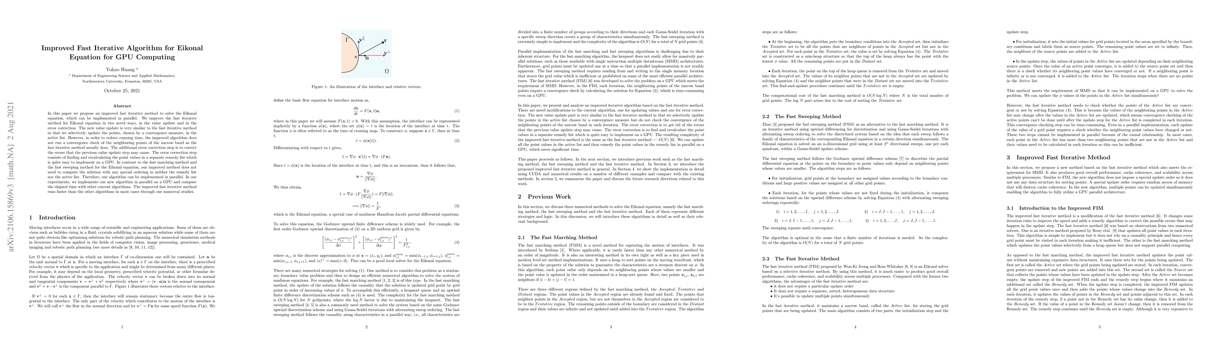 This paper presents an enhanced fast iterative algorithm for solving the Eikonal equation on GPU, featuring improved value updates and error correction to reduce running time. The proposed method achieves faster performance compared to existing algorithms through parallel implementation.