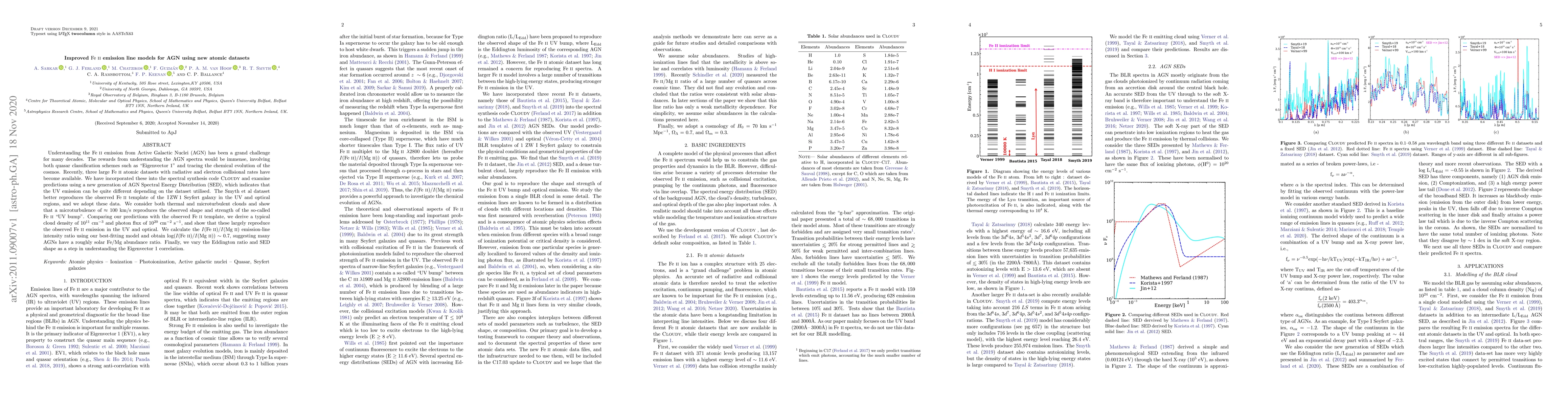 Understanding the Fe II emission from Active Galactic Nuclei (AGN) has been a grand challenge for many decades. The rewards from understanding the AGN spectra would be immense, involving both quasar classification schemes such as "Eigenvector 1" and tracing the chemical evolution of the cosmos. Recently, three large Fe II atomic datasets with radiative and electron collisional rates have become available. We have incorporated these into the spectral synthesis code Cloudy and examine predictions using a new generation of AGN Spectral Energy Distribution (SED), which indicates that the UV emission can be quite different depending on the dataset utilized. The Smyth et al dataset better reproduces the observed Fe II template of the I ZW 1 Seyfert galaxy in the UV and optical regions, and we adopt these data. We consider both thermal and microturbulent clouds and show that a microturbulence of $\approx$ 100 km/s reproduces the observed shape and strength of the so-called Fe II "UV bump". Comparing our predictions with the observed Fe II template, we derive a typical cloud density of $10^{11}$ cm$^{-3}$ and photon flux of $10^{20}$ cm$^{-2}$ s$^{-1}$, and show that these largely reproduce the observed Fe II emission in the UV and optical. We calculate the $I$(Fe II)/$I$(Mg II) emission-line intensity ratio using our best-fitting model and obtain log($I$(Fe II)/$I$(Mg II)) $\sim$ 0.7, suggesting many AGNs have a roughly solar Fe/Mg abundance ratio. Finally, we vary the Eddington ratio and SED shape as a step in understanding the Eigenvector 1 correlation.