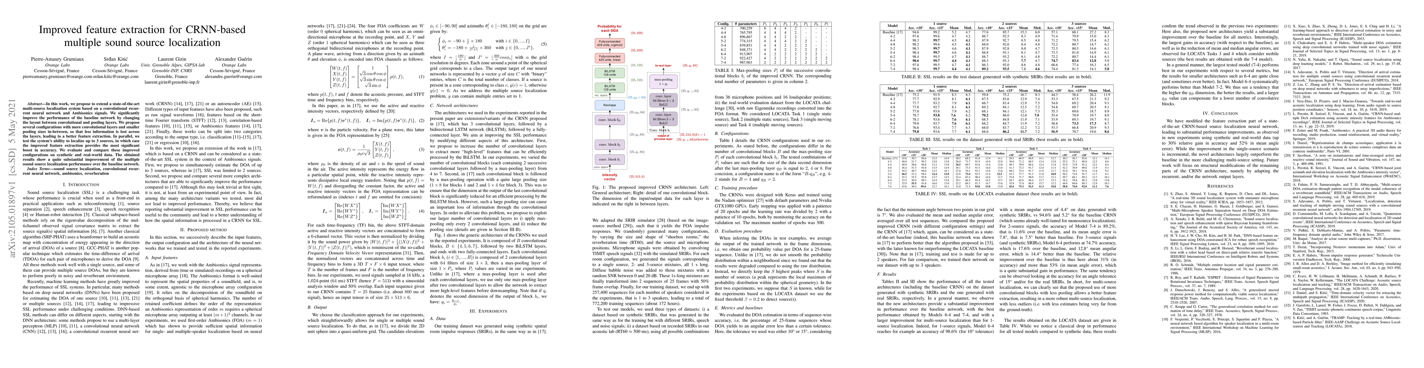 In this work, we propose to extend a state-of-the-art multi-source localization system based on a convolutional recurrent neural network and Ambisonics signals. We significantly improve the performance of the baseline network by changing the layout between convolutional and pooling layers. We propose several configurations with more convolutional layers and smaller pooling sizes in-between, so that less information is lost across the layers, leading to a better feature extraction. In parallel, we test the system's ability to localize up to 3 sources, in which case the improved feature extraction provides the most significant boost in accuracy. We evaluate and compare these improved configurations on synthetic and real-world data. The obtained results show a quite substantial improvement of the multiple sound source localization performance over the baseline network.