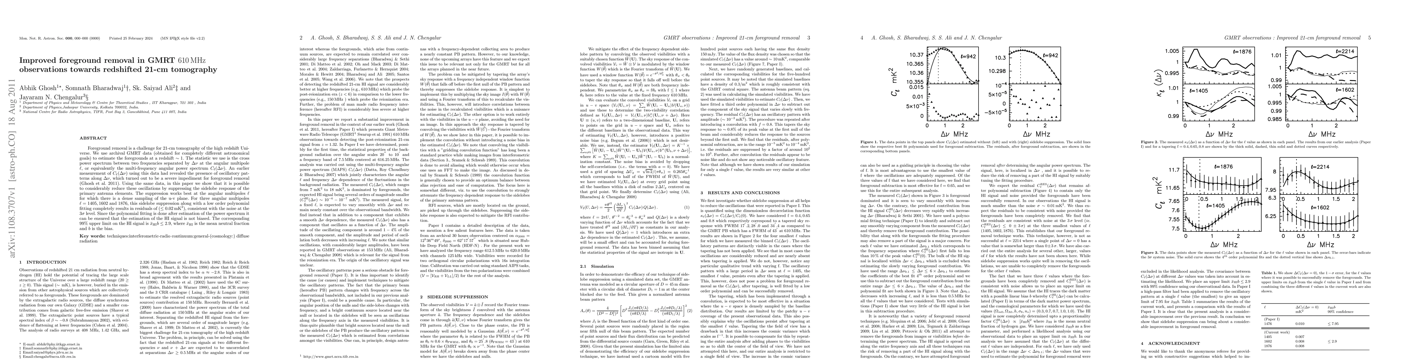 Foreground removal is a challenge for 21-cm tomography of the high redshift Universe. We use archival GMRT data (obtained for completely different astronomical goals) to estimate the foregrounds at a redshift ~ 1. The statistic we use is the cross power spectrum between two frequencies separated by \Delta{\nu} at the angular multipole l, or equivalently the multi-frequency angular power spectrum C_l(\Delta{\nu}). An earlier measurement of C_l(\Delta{\nu}) using this data had revealed the presence of oscillatory patterns along \Delta{\nu}, which turned out to be a severe impediment for foreground removal (Ghosh et al. 2011). Using the same data, in this paper we show that it is possible to considerably reduce these oscillations by suppressing the sidelobe response of the primary antenna elements. The suppression works best at the angular multipoles l for which there is a dense sampling of the u-v plane. For three angular multipoles l = 1405, 1602 and 1876, this sidelobe suppression along with a low order polynomial fitting completely results in residuals of (\leq 0.02 mK^2), consistent with the noise at the 3{\sigma} level. Since the polynomial fitting is done after estimation of the power spectrum it can be ensured that the estimation of the HI signal is not biased. The corresponding 99% upper limit on the HI signal is xHI b \leq 2.9, where xHI is the mean neutral fraction and b is the bias.