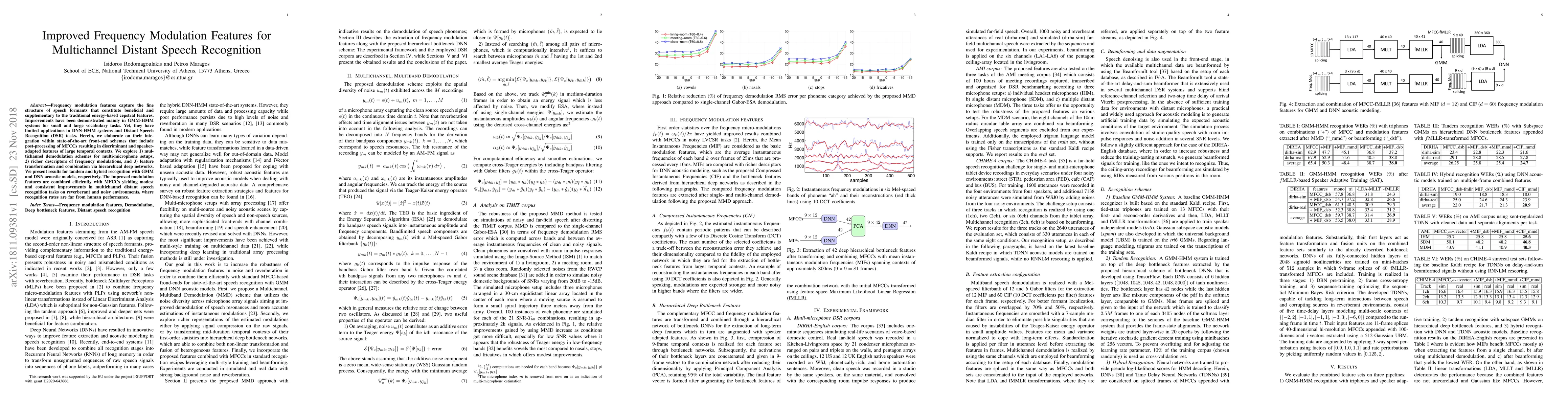 Frequency modulation features capture the fine structure of speech formants that constitute beneficial and supplementary to the traditional energy-based cepstral features. Improvements have been demonstrated mainly in GMM-HMM systems for small and large vocabulary tasks. Yet, they have limited applications in DNN-HMM systems and Distant Speech Recognition (DSR) tasks. Herein, we elaborate on their integration within state-of-the-art front-end schemes that include post-processing of MFCCs resulting in discriminant and speaker adapted features of large temporal contexts. We explore 1) multichannel demodulation schemes for multi-microphone setups, 2) richer descriptors of frequency modulations, and 3) feature transformation and combination via hierarchical deep networks. We present results for tandem and hybrid recognition with GMM and DNN acoustic models, respectively. The improved modulation features are combined efficiently with MFCCs yielding modest and consistent improvements in multichannel distant speech recognition tasks on reverberant and noisy environments, where recognition rates are far from human performance.