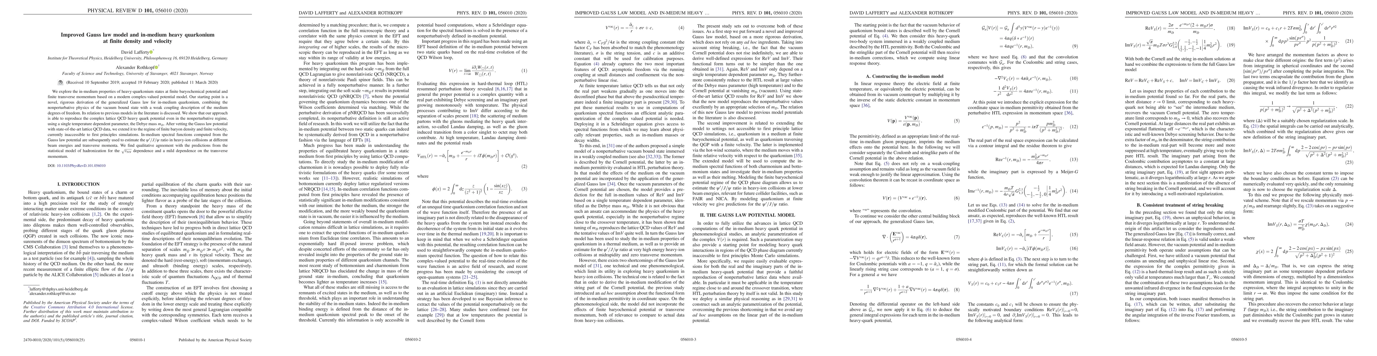 We explore the in-medium properties of heavy-quarkonium states at finite baryo-chemical potential and finite transverse momentum based on a modern complex-valued potential model. Our starting point is a novel, rigorous derivation of the generalized Gauss law for in-medium quarkonium, combining the non-perturbative physics of the vacuum bound state with a weak coupling description of the medium degrees of freedom. Its relation to previous models in the literature is discussed. We show that our approach is able to reproduce the complex lattice QCD heavy quark potential even in the non-perturbative regime, using a single temperature dependent parameter, the Debye mass $m_D$. After vetting the Gauss-law potential with state-of-the-art lattice QCD data, we extend it to the regime of finite baryon density and finite velocity, currently inaccessible to first principles simulations. In-medium spectral functions computed from the Gauss-law potential are subsequently used to estimate the $\psi'/J/\psi$ ratio in heavy-ion collisions at different beam energies and transverse momenta. We find qualitative agreement with the predictions from the statistical model of hadronization for the $\sqrt{s_{NN}}$ dependence and a mild dependence on the transverse momentum.