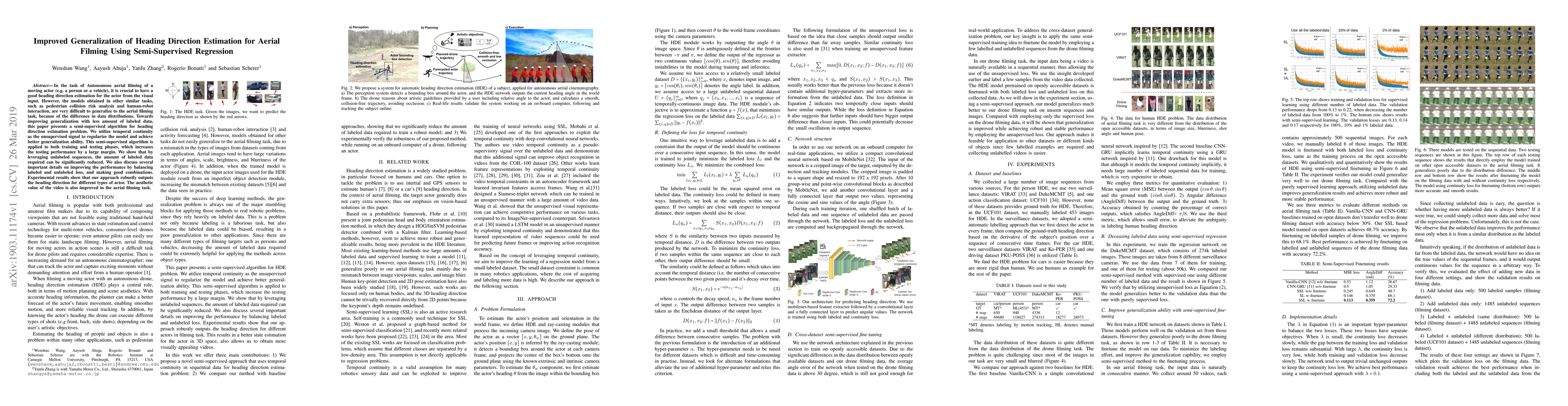 In the task of Autonomous aerial filming of a moving actor (e.g. a person or a vehicle), it is crucial to have a good heading direction estimation for the actor from the visual input. However, the models obtained in other similar tasks, such as pedestrian collision risk analysis and human-robot interaction, are very difficult to generalize to the aerial filming task, because of the difference in data distributions. Towards improving generalization with less amount of labeled data, this paper presents a semi-supervised algorithm for heading direction estimation problem. We utilize temporal continuity as the unsupervised signal to regularize the model and achieve better generalization ability. This semi-supervised algorithm is applied to both training and testing phases, which increases the testing performance by a large margin. We show that by leveraging unlabeled sequences, the amount of labeled data required can be significantly reduced. We also discuss several important details on improving the performance by balancing labeled and unlabeled loss, and making good combinations. Experimental results show that our approach robustly outputs the heading direction for different types of actor. The aesthetic value of the video is also improved in the aerial filming task.