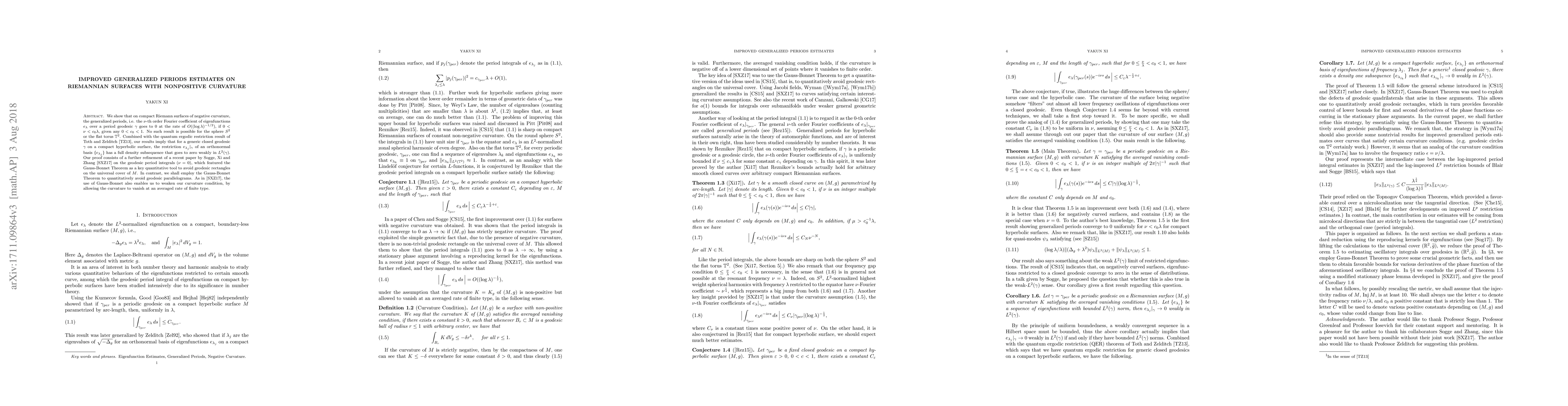 This paper demonstrates improved estimates for generalized periods on compact Riemann surfaces of negative curvature, showing that $\nu$-th order Fourier coefficients of eigenfunctions decay at a rate of $O((\log\lambda)^{-1/2})$. The results do not apply to the sphere or flat torus, and they imply weak convergence to zero for a full density subsequence of eigenfunctions restricted to generic closed geodesics. The proof refines techniques from a previous work by Sogge, Xi, and Zhang, using the Gauss-Bonnet Theorem to avoid geodesic parallelograms and relax curvature conditions.