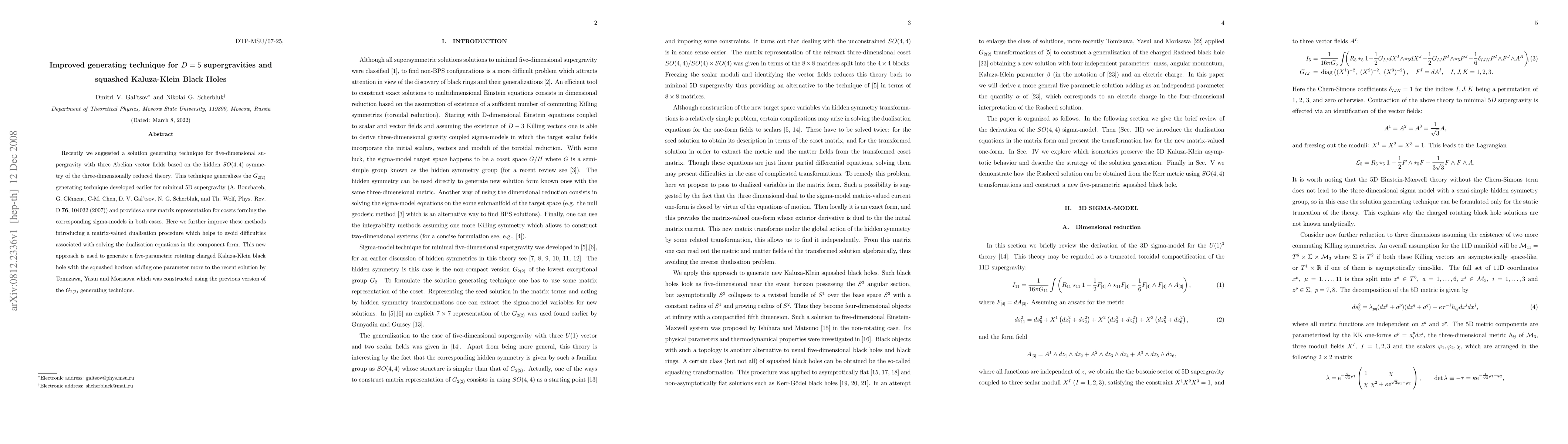 This paper presents an improved generating technique for five-dimensional supergravities, enhancing the $G_{2(2)}$ method with a matrix-valued dualisation procedure. It generates a five-parametric rotating charged Kaluza-Klein black hole with a squashed horizon, extending previous solutions.
