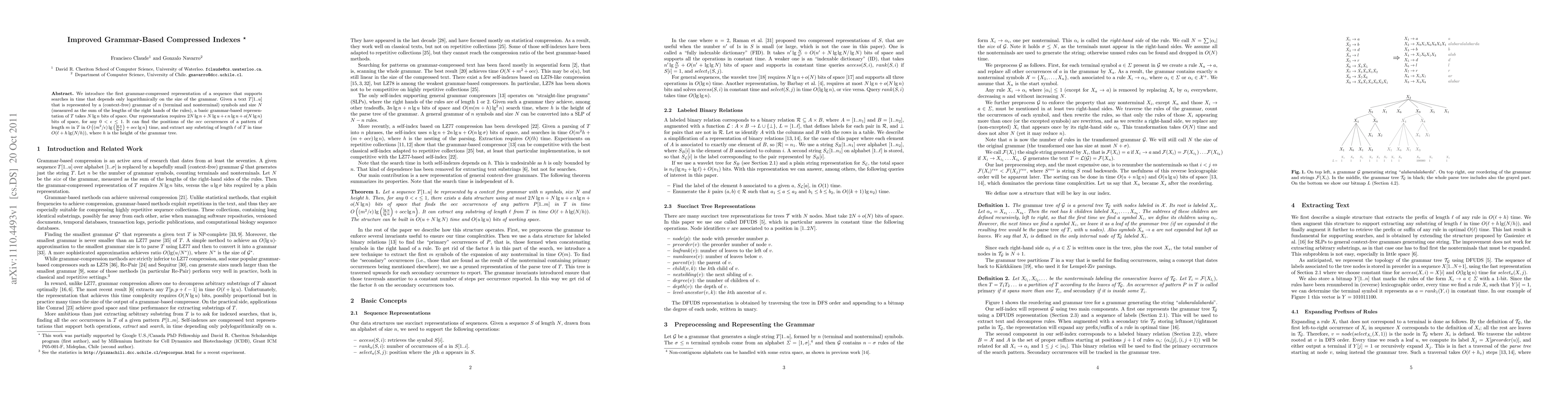 This paper presents a novel grammar-compressed index that reduces space requirements and improves search efficiency for text represented by context-free grammars, achieving logarithmic time complexity for pattern searches and substring extractions.