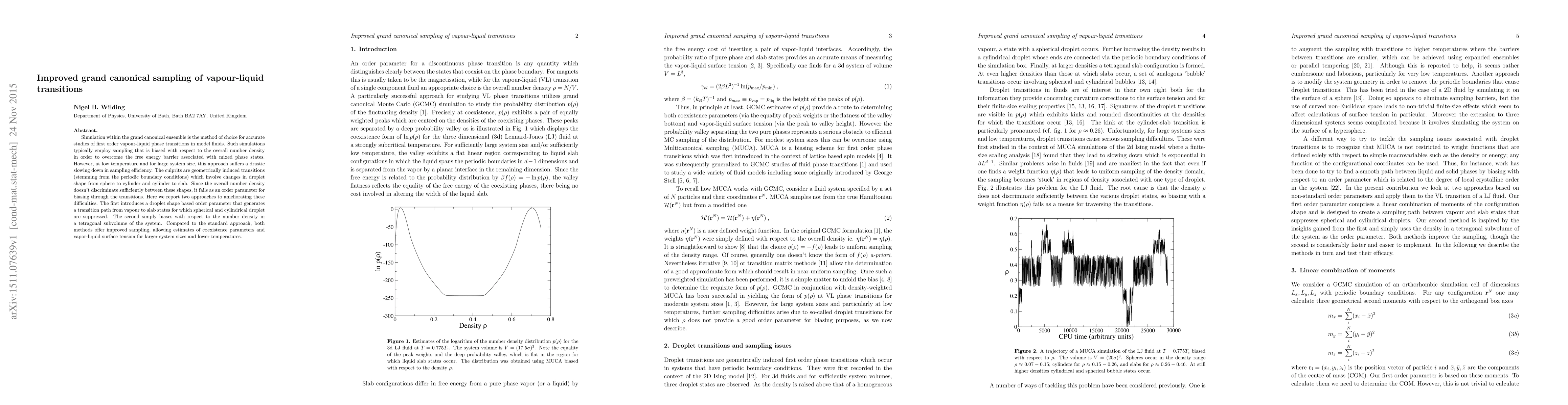 This paper proposes two improved sampling techniques for grand canonical ensemble simulations of vapour-liquid phase transitions, addressing the efficiency issues caused by geometrically induced transitions. The methods enhance sampling efficiency, allowing better estimates of coexistence parameters and surface tension at lower temperatures and larger system sizes.