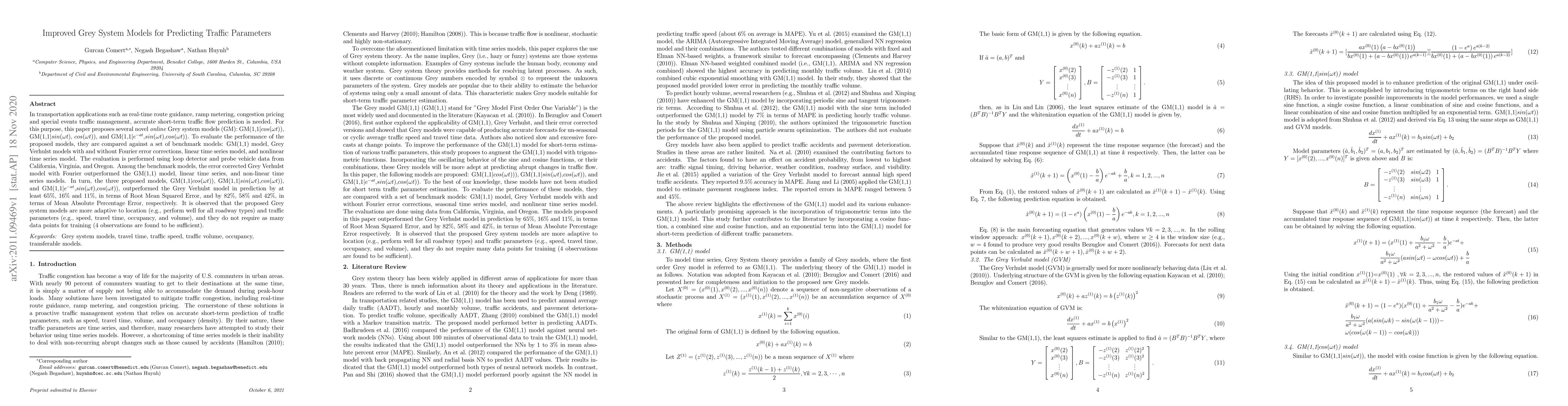 In transportation applications such as real-time route guidance, ramp metering, congestion pricing and special events traffic management, accurate short-term traffic flow prediction is needed. For this purpose, this paper proposes several novel \textit{online} Grey system models (GM): GM(1,1$|cos(\omega t)$), GM(1,1$|sin(\omega t)$, $cos(\omega t)$), and GM(1,1$|e^{-at}$,$sin(\omega t)$,$cos(\omega t)$). To evaluate the performance of the proposed models, they are compared against a set of benchmark models: GM(1,1) model, Grey Verhulst models with and without Fourier error corrections, linear time series model, and nonlinear time series model. The evaluation is performed using loop detector and probe vehicle data from California, Virginia, and Oregon. Among the benchmark models, the error corrected Grey Verhulst model with Fourier outperformed the GM(1,1) model, linear time series, and non-linear time series models. In turn, the three proposed models, GM(1,1$|cos(\omega t)$), GM(1,1$|sin(\omega t)$,$cos(\omega t)$), and GM(1,1$|e^{-at}$,$sin(\omega t)$,$cos(\omega t)$), outperformed the Grey Verhulst model in prediction by at least $65\%$, $16\%$, and $11\%$, in terms of Root Mean Squared Error, and by $82\%$, $58\%$, and $42\%$, in terms of Mean Absolute Percentage Error, respectively. It is observed that the proposed Grey system models are more adaptive to location (e.g., perform well for all roadway types) and traffic parameters (e.g., speed, travel time, occupancy, and volume), and they do not require as many data points for training (4 observations are found to be sufficient).