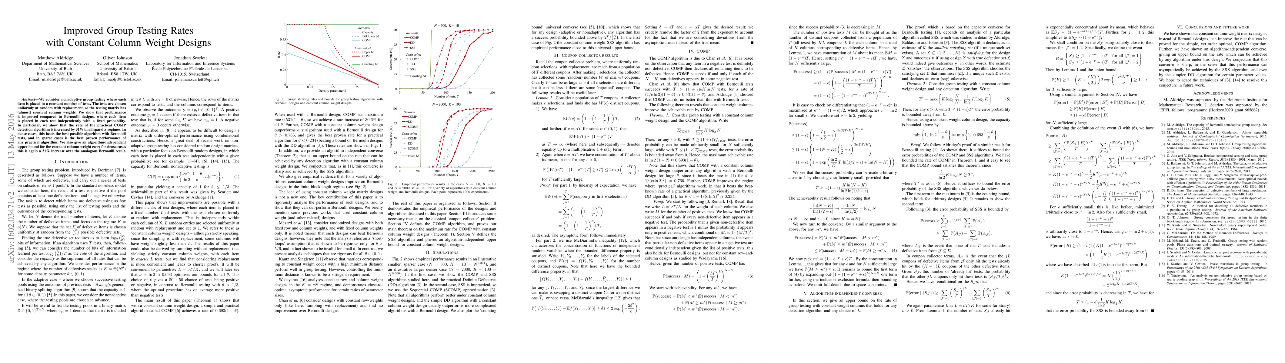 This paper demonstrates that nonadaptive group testing with constant column weight designs significantly improves detection rates compared to Bernoulli designs, achieving a 31% increase in practical COMP detection algorithm efficiency across all sparsity regimes. The method outperforms the best possible algorithms in dense cases and provides the best proven performance for sparse cases.
