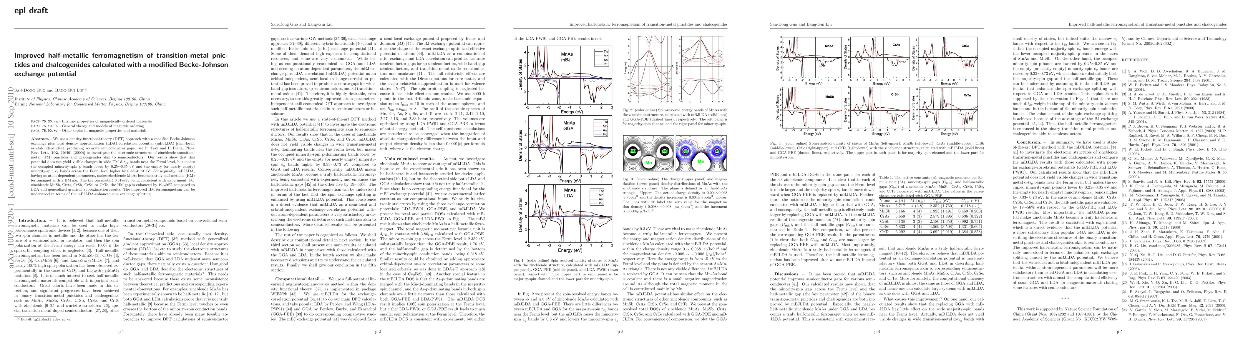 This paper uses a modified Becke-Johnson exchange potential (mBJLDA) in density-functional theory to enhance half-metallic ferromagnetism in zincblende transition-metal pnictides and chalcogenides. The mBJLDA method significantly lowers minority-spin bands, resulting in improved half-metallic gaps and enhanced spin exchange splitting, particularly for MnAs and other compounds like CrAs.