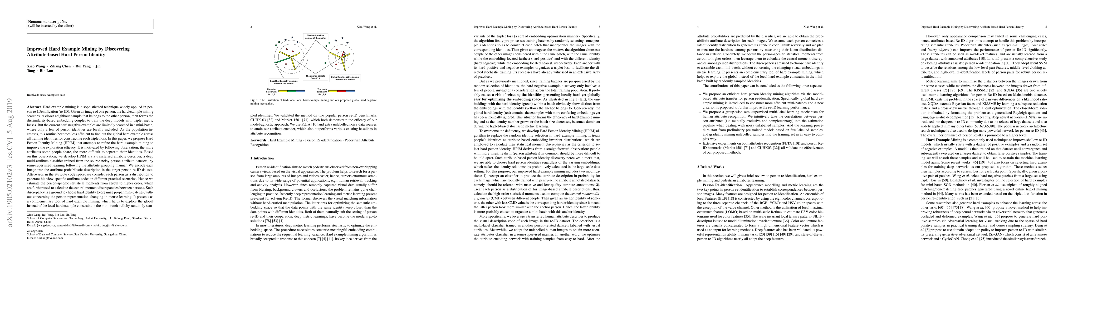 The paper proposes Hard Person Identity Mining (HPIM) for person re-identification, utilizing a transferred attribute describer trained on noisy person attribute datasets. It encodes images into attribute probabilistic descriptions and considers each person as a distribution to generate view-specific attribute codes. The method calculates central moment discrepancies to choose hard identities for mini-batch creation, complementing traditional hard example mining.